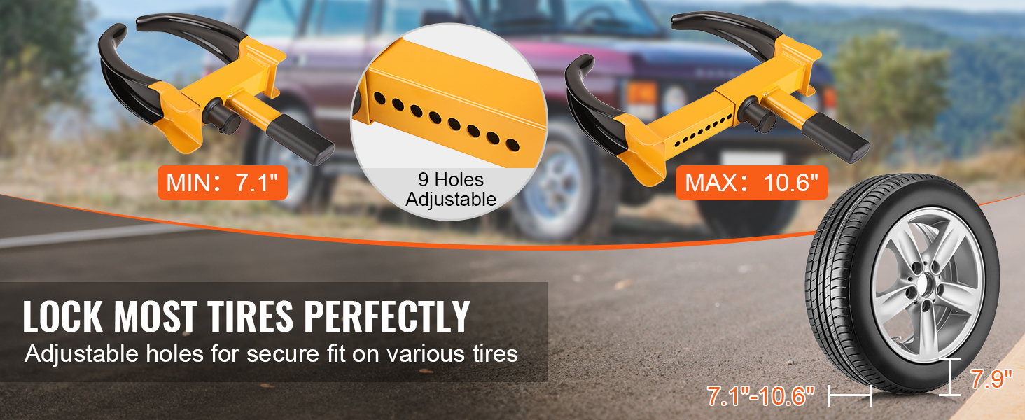 Universelle Reifenanpassung: Unser Radschloss verfügt über 9-Loch-Positionseinstellungen im Bereich von 7,1 bis 10,6 Zoll (100,84 bis 269,24 mm) und gewährleistet so eine präzise und sichere Verriegelung für die meisten Reifengrößen. Bitte beachten Sie, dass die Reifendicke weniger als 7,9 Zoll (200,66 mm) betragen sollte.