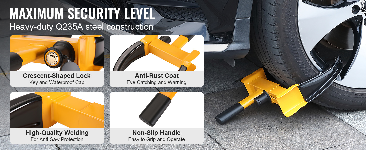Die VEVOR-Radkralle sichert Ihr Fahrzeug jederzeit und überall. Sie verhindert den Diebstahl von Reifen und Fahrzeugen. Jede Raddiebstahlsicherung ist mit einer PVC-Beschichtung versehen, die das Fahrzeug sichert, den Reifen und die Radnabe schützt und die Gefahr von Kratzern verringert.