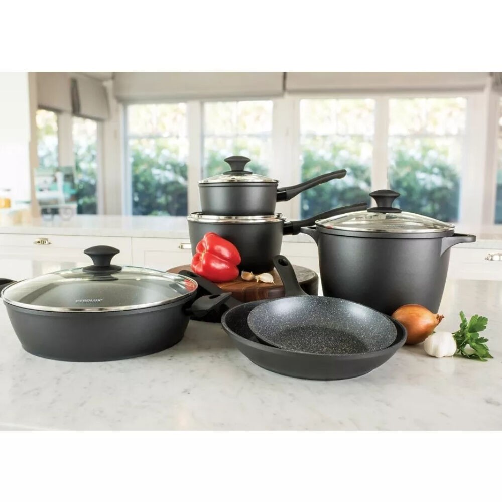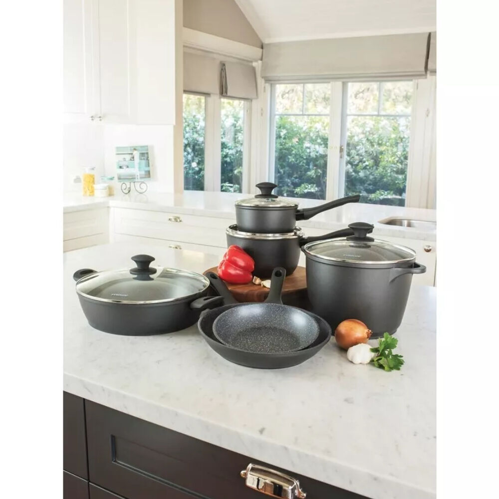 Enhance your everyday cooking with PYROLUX PYROSTONE. Carefully crafted from forged aluminium, the range features a stone line finish for quick and easy cooking, long lasting food release and faster clean up. Cookware that provides extreme toughness, superior non stick surfaces with superb abrasion resistance. Enjoy healthier cooking using less oil on the special PFOA free non-stick coating! The easy view tempered glass lids allow you to easily monitor your food as it cooks with inbuilt steam release vent. Soft touch ergonomic handles are attached to the cookware for superior strength and durability, designed for heat resistance to stay cool for longer on cooktops. Easy to clean surface with no visible rivets. Suitable for all cooktops including induction and oven safe to 180°C.