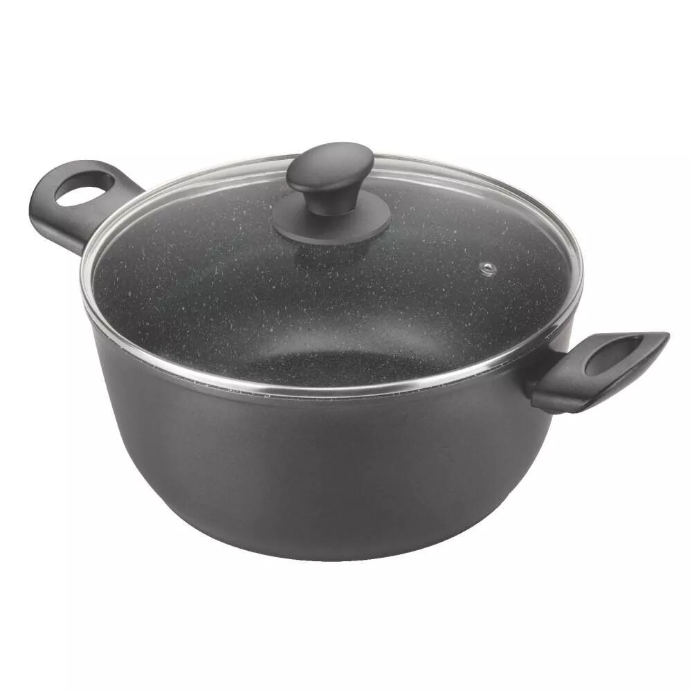 Enhance your everyday cooking with this PYROSTONE 26cm/6L casserole. Carefully crafted from forged aluminium, the range features a stone line finish for quick and easy cooking, long lasting food release and faster clean up. Cookware that provides extreme toughness, superior non stick surfaces with superb abrasion resistance. Enjoy healthier cooking using less oil on the special PFOA free non-stick coating! The easy view tempered glass lid allows you to easily monitor your food as it cooks with inbuilt steam release vent. Soft touch ergonomic handles are attached to the cookware for superior strength and durability, designed for heat resistance to stay cool for longer on cooktops. Easy to clean surface with no visible rivets. Suitable for all cooktops including induction and oven safe to 180°C.