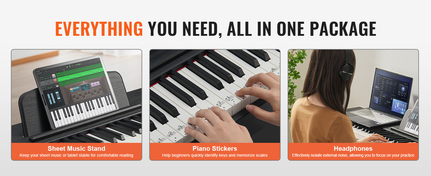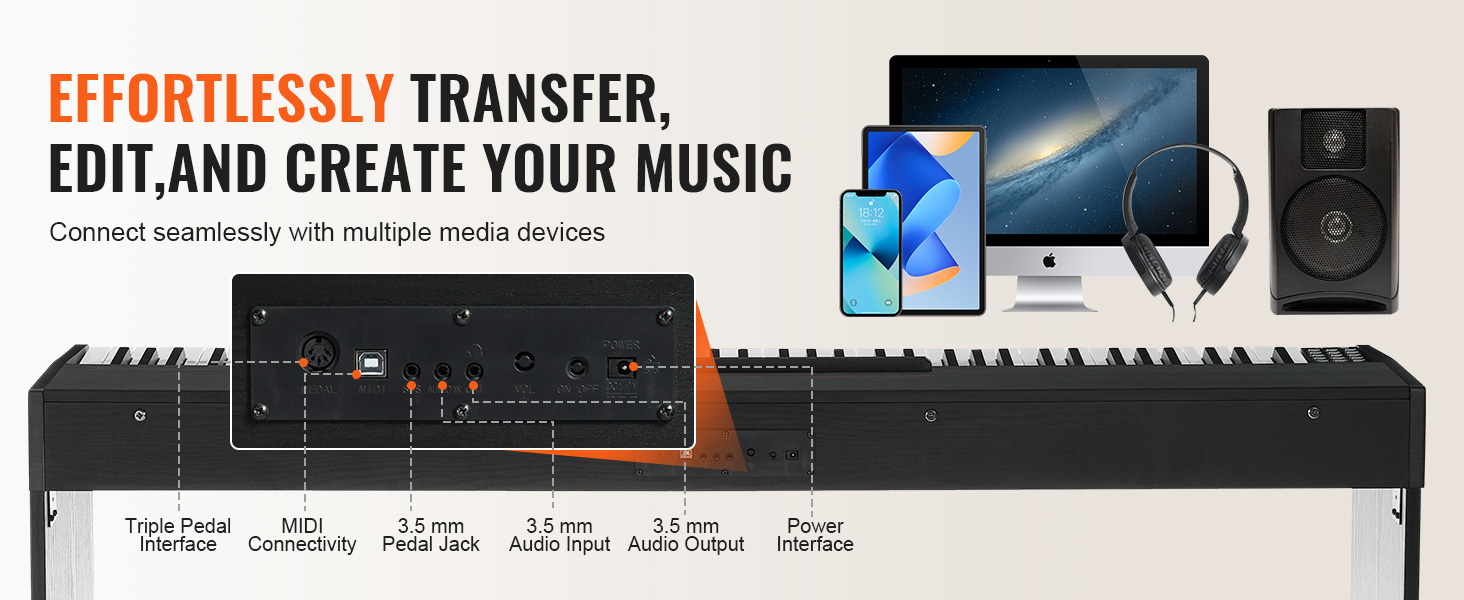 MIDI- und Bluetooth-Übertragung: Die verschiedenen Übertragungsmethoden des 88-Tasten-Pianos ermöglichen eine effiziente Verbindung. Ausgestattet mit Audioausgang, Mikrofonanschluss und Audioeingang, sodass Sie Kopfhörer anschließen können, um intensiv zu lernen, ohne Ihre Nachbarn zu stören. Stabiler Notenständer für bequemes Lesen. Klavieraufkleber im Lieferumfang enthalten, um die Tasten schnell zu identifizieren.