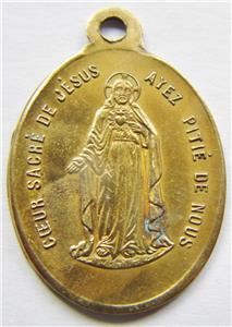 A beautiful antique brass holy medal here of Our Lady of the Sacred Heart Virgin Mary immaculate and Jesus . 30mm or 1 1/4 inch. From the late 19th century.