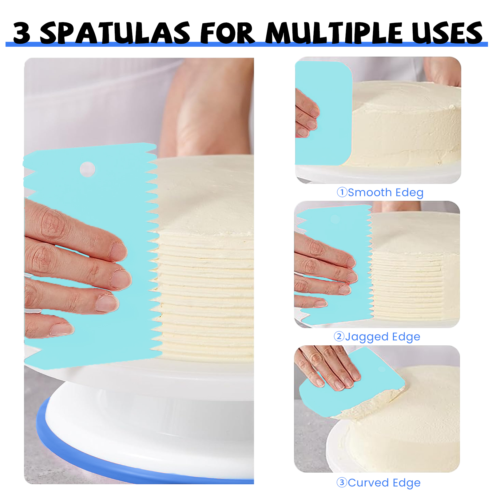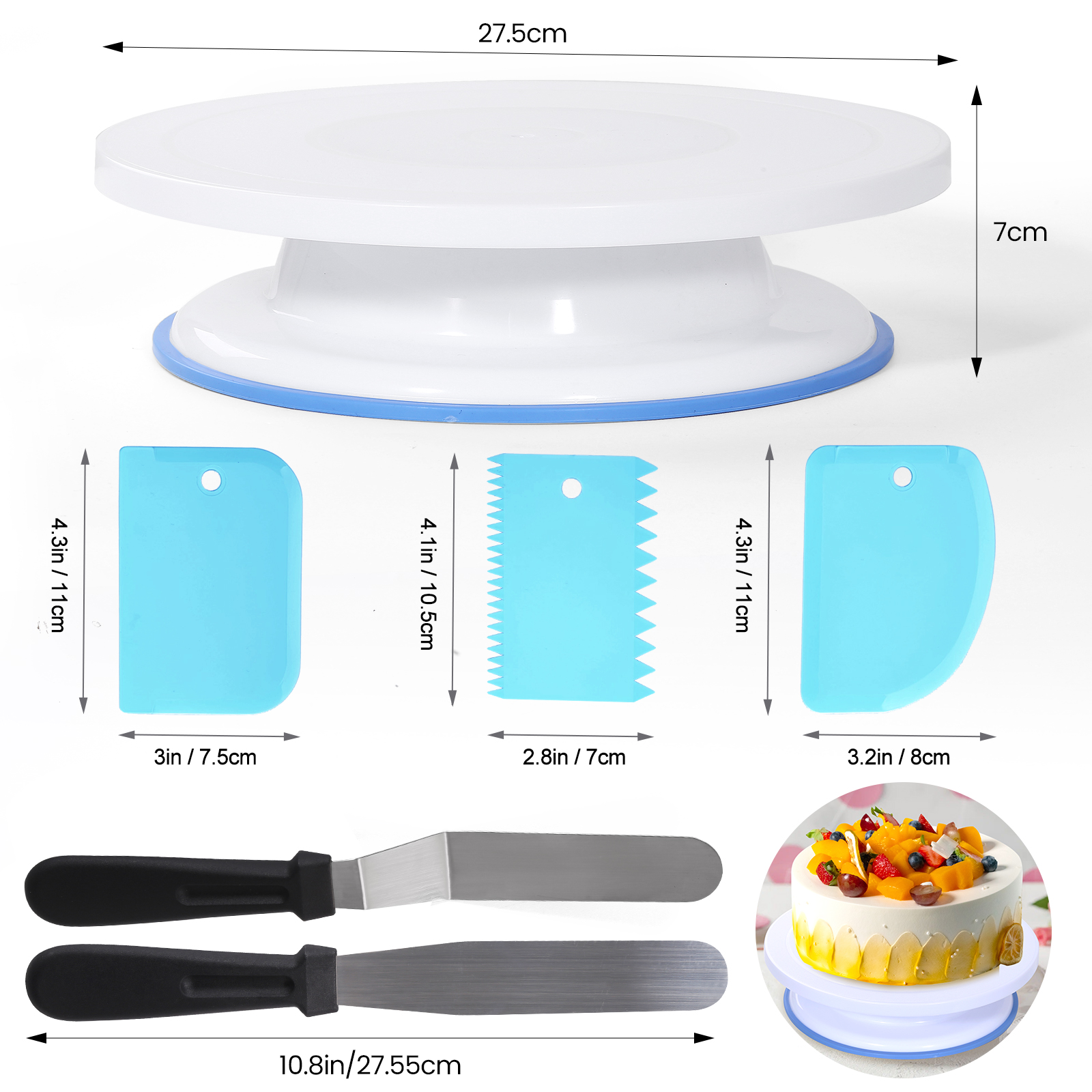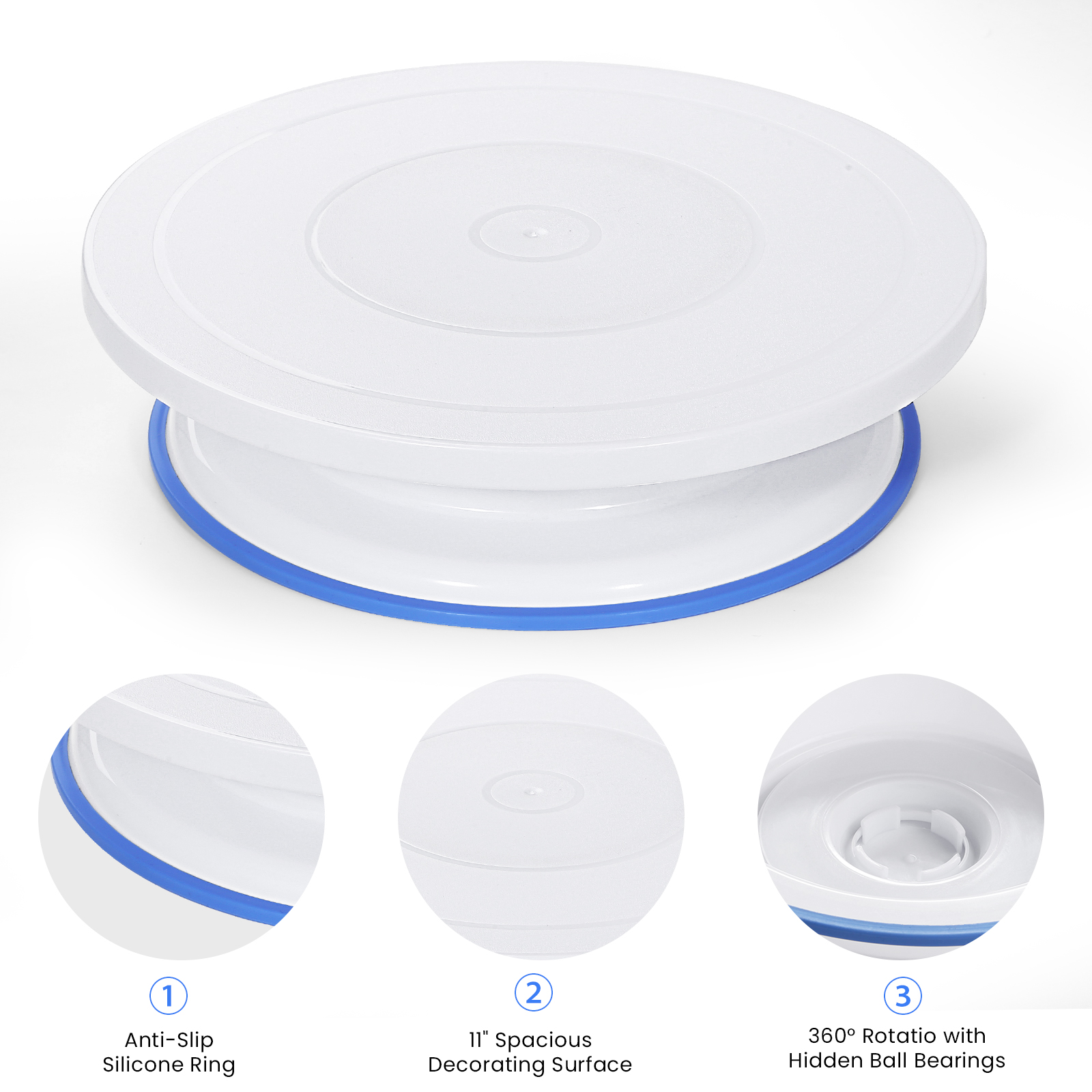 Product advantages: flexible spindle, non-slip bottom pad, silent design, frosted surface Product features: Symbol of international food safety standards, can be used directly in contact with food Material: PP+TRP Product use: cake laminating, pastry display table, pastry bakery turntable, etc. Accessories: 1* turntable 2*knife 1*scissors 3*spatula 2*laminating bag 2*laminating pins 2*laminating nozzle fixing ring 1*plastic nozzle 1*pocket nozzle