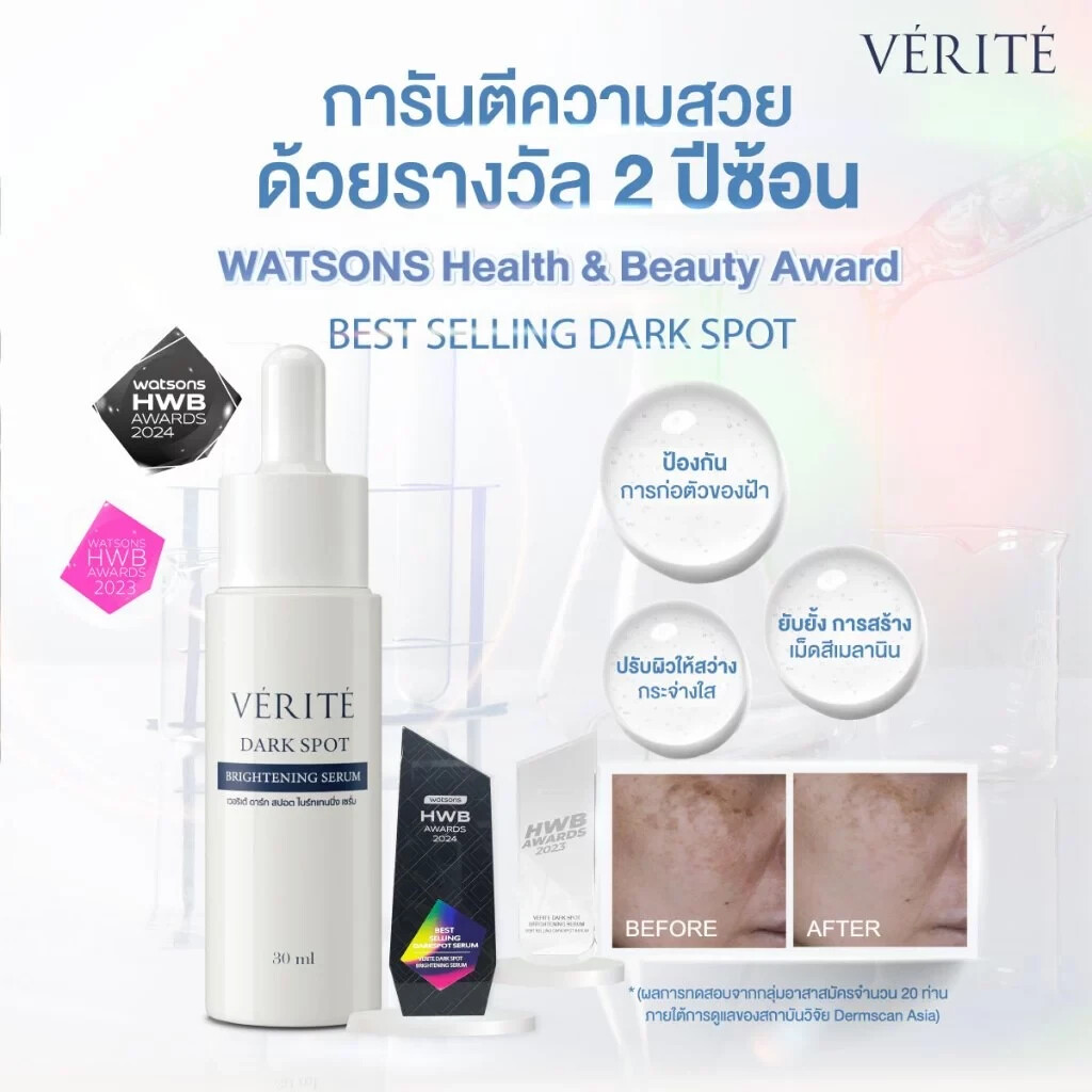 Conditions: Brand New, Sealed Quantity: 30 ml. x 1 piece VERITE Dark Spot Brightening Serum 30 ml.This premium facial serum is designed to brighten skin tone and reduce dark spots and acne scars. It combines advanced ingredients to provide a comprehensive skincare solution.KEY BENEFITSBrightening & Whitening: Contains 3-O-Ethyl Ascorbic Acid (ENB-VCE), a stable and effective form of Vitamin C, and 4MSK (Potassium Methoxysalicylate) to lighten pigmentation and even out skin tone.Anti-Aging & Hydration: Features Palmitoyl Pentapeptide-4 (Matrixyl) to stimulate collagen production, reduce fine lines, and enhance skin hydration.Soothing & Anti-Inflammatory: Allantoin and Dipotassium Glycyrrhizate help calm irritated skin and reduce inflammation.Enhanced Absorption: Ethoxydiglycol acts as a carrier to deliver active ingredients deeper into the skin layers.INGREDIENTS AQUA,PROPYLENE GLYCOL, GLYCERIN, PROPANEDIOL,ETHOXYDIGLYCOL, 3-O-ETHYL ASCORBIC ACID, POTASSIUM METHOXYSALICYLATE, BUTYLENEGLYCOL, ALLANTOIN, POLYSORBATE 20, SODIUM HYALURONATE, DIPOTASSIUMGLYCYRRHIZATE, DISODIUM EDTA, XANTHAN GUM, HYDROXYPROPYL METHYLCELLULOSE, CARBOMER, SODIUM CITRATE, LAVANDULA ANGUSTIFOLIA OIL, CITRIC ACID, THYMUSMASTICHINA FLOWER OIL, PALMITOYL PENTAPEPTIDE-4, ANTHEMIS NOBILIS FLOWER OIL, NARCISSUS TAZETTA BULB EXTRACT, PHENOXYETHANOL, CHLORPHENESIN, POTASSIUMSORBATE