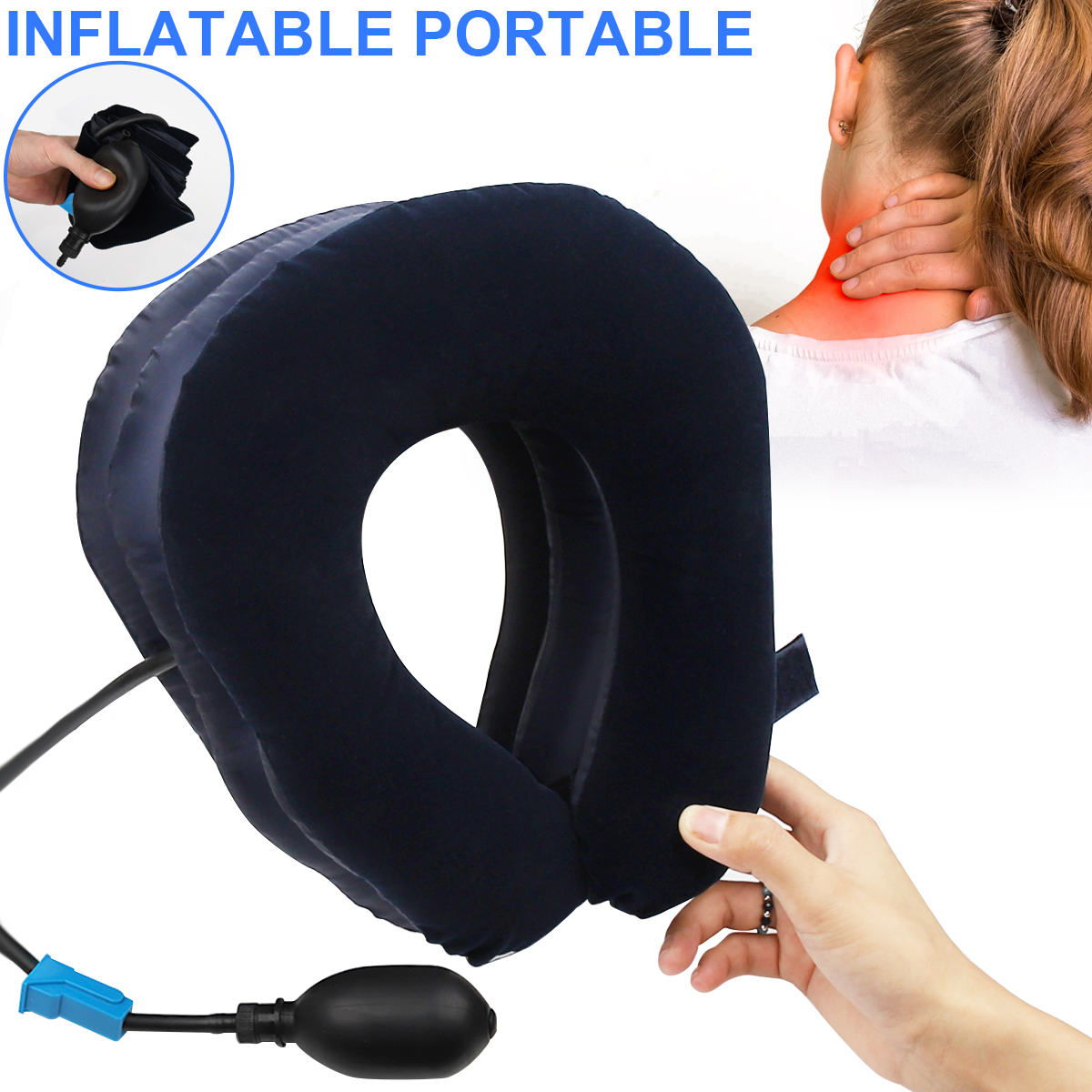 This inflatable neck pillow has a soft head and neck support. The air neck traction uses air which is slowly introduced by an inflation bulb into the pillow device. Air pressure around the neck builds up in a vertical direction in order to soothe and stretch the tight muscles and relieve joint pressure felt in the area of the neck. Intra-vertebral disc pressure is relieved by the elongating pull, allowing more space for the nerve roots and smoothing out knots in the neck muscles. It also helps keep the neck warm and serves as a reminder to limit head and neck motion.