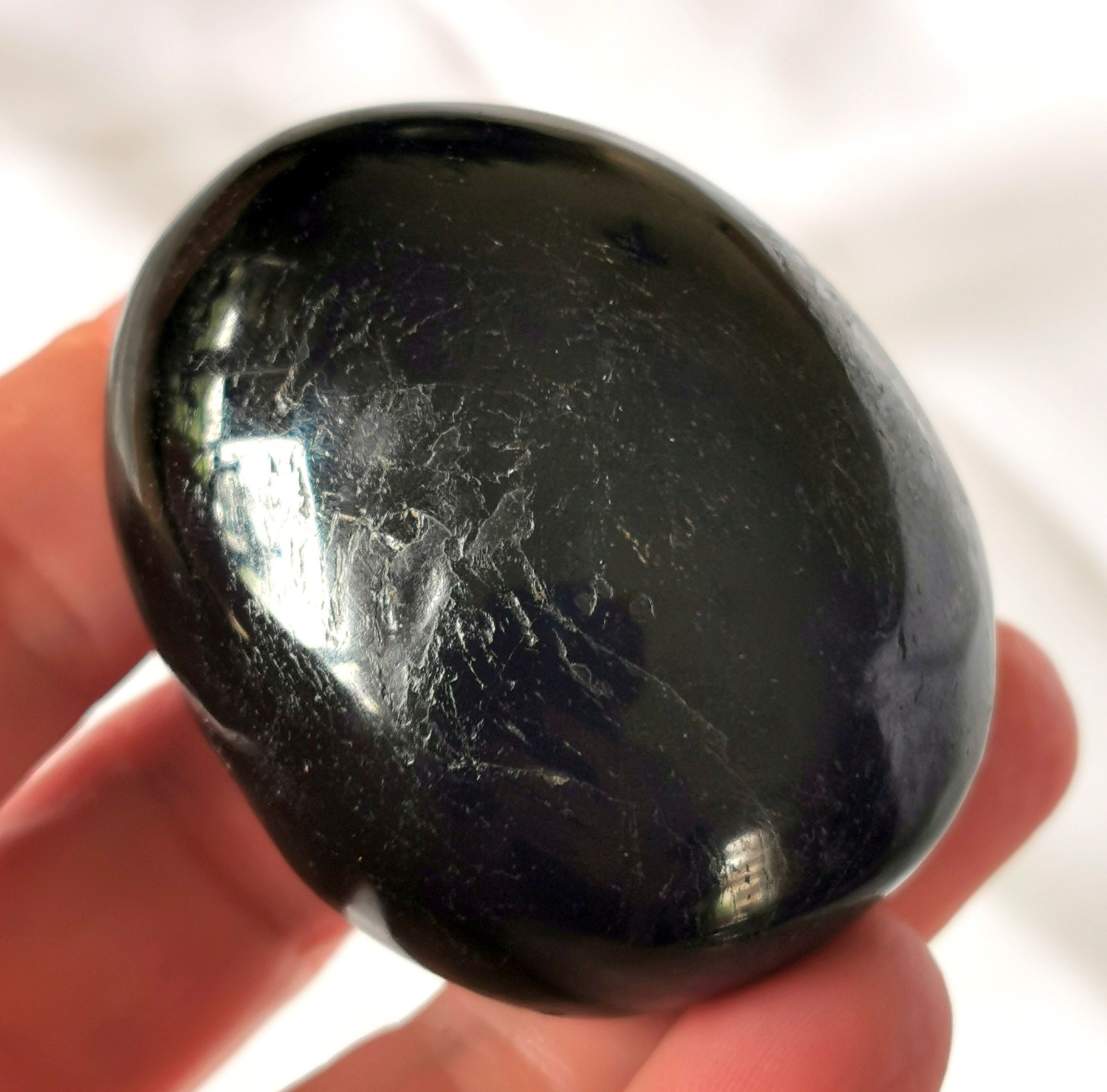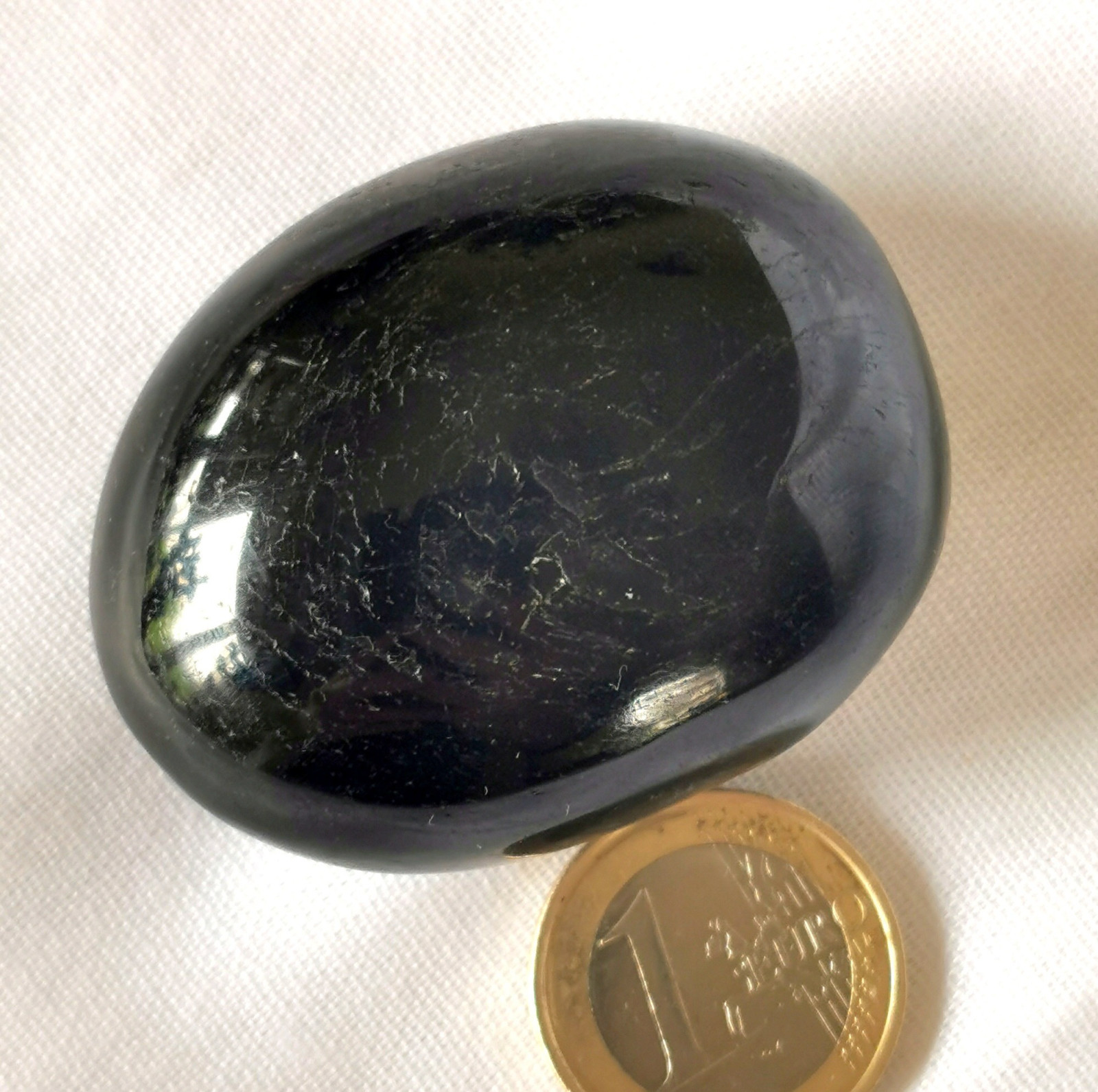 wunderbarer Handschmeichler aus schwarzem Turmalin (Schörl) aus Madagaskar, Abmessungen ca. 52 * 41 * 28 mm, Gewicht ca. 108 Gramm.