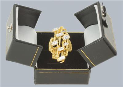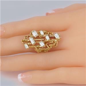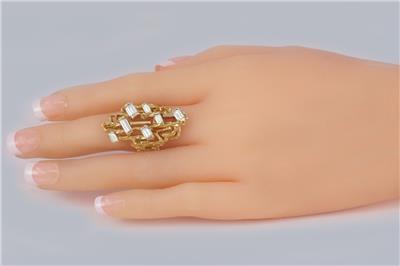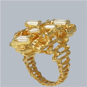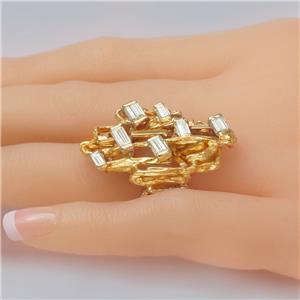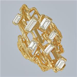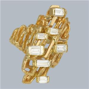 Designed in an abstract modernist style, the ring is fashioned from richly textured 18ct yellow gold and set with seven superb baguette-cut diamonds, all of varying sizes to enhance its unique, sculptural appearance.