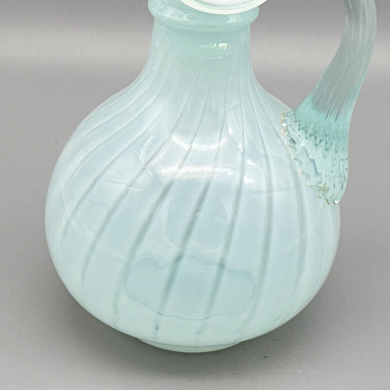 This is a nice Fenton cruet in an unusual and attractive color, “Minted Cream” and a “Spiral Optic” pattern. Minted Cream is similar to classic Blue Opalescent but is slightly greener. Fenton made the color as part of its “Ice Cream Colors” collection in 1986 and 1987; these colors were an attempt to exploit the “cool color” decorating trend of the time by marketing colors that are reminiscent of ice cream. A unique and unusual piece!