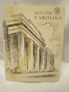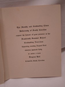 Offered for sale is a graduation announcement for the 1940 graduating class of the University of South Carolina. The Fourteenth Summer School Graduating Exercises were conducted on August 1st, 1940 at 7:00 pm. The announcement is yellowed along the glue seam of the envelope on the front. The inside of the announcement is in good condition.