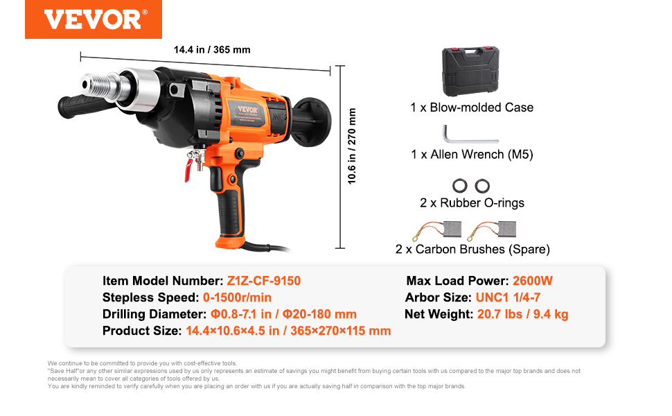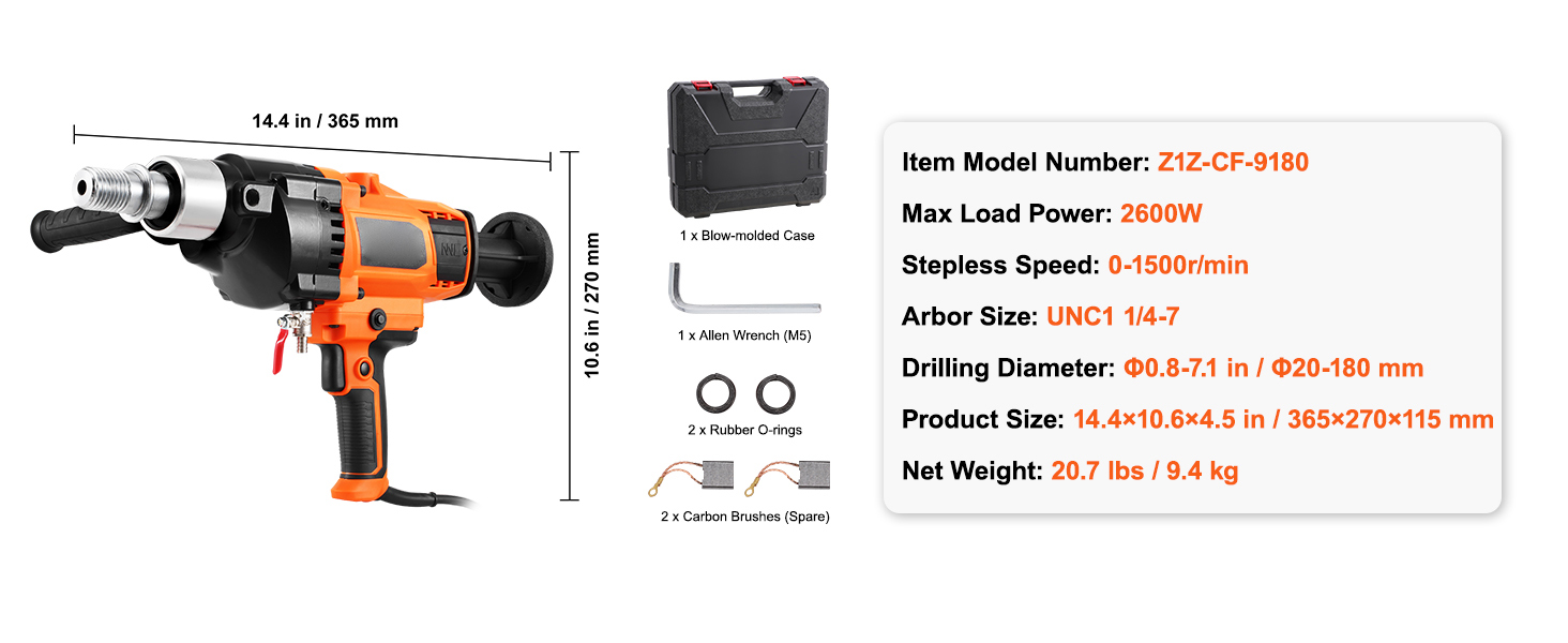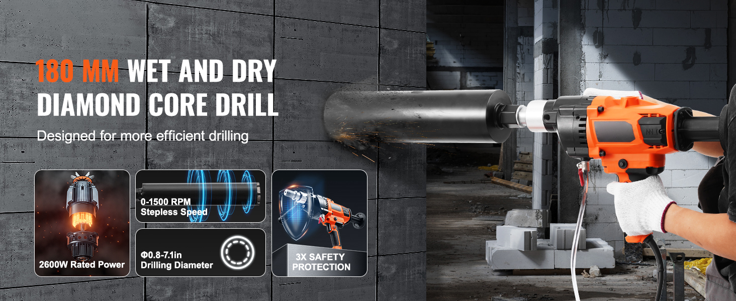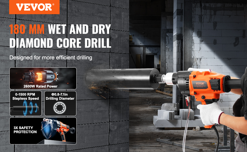 Leistungsstarkes Kernbohren: Ausgestattet mit einem 2600 W Motor und einstellbarer Geschwindigkeit kann dieses Kernbohrgerät mühelos Löcher von Φ0,8-7,1 Zoll / Φ20-180 mm bohren. Ob große oder kleine Löcher gebohrt werden müssen, mit diesem Werkzeug wird jede Aufgabe effizient und präzise erledigt.