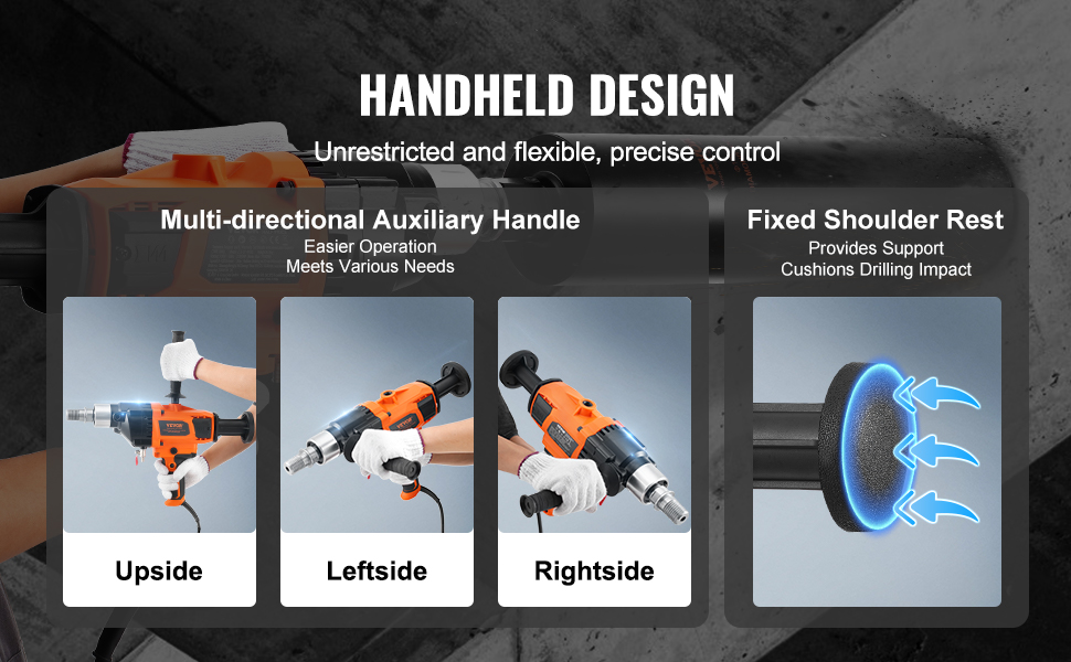 Handgeführtes Design für maximale Steuerung: Die Kernbohrmaschine zeichnet sich durch eine optimierte Gewichtsverteilung und ein strukturelles Design aus, das eine einfache Handhabung in verschiedenen Bauumgebungen ermöglicht. Ob Sie in engen Räumen oder in großen Höhen arbeiten, Sie können den Bohrwinkel und die Bohrtiefe einfach einstellen, um jedes Mal perfekte Ergebnisse zu erzielen.