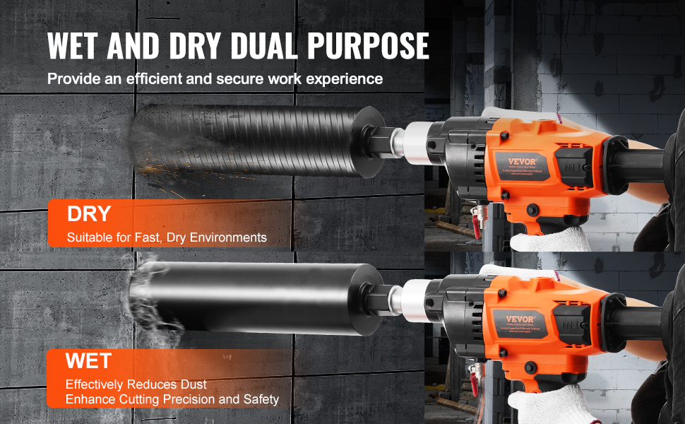 Nass- und Trockenschneiden: Unser Betonkernbohrer unterstützt sowohl den Trocken- als auch den Nassschneidemodus. Der Trockenschneidemodus ist ideal für schnelles Bohren in trockenen Umgebungen oder bei hohen Leistungsanforderungen, während der Nassschneidemodus die Staub- und Hitzeentwicklung reduziert und so für mehr Sicherheit und Komfort bei der Arbeit sorgt.