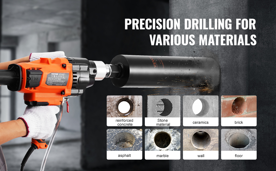 Entwickelt für Präzisionsbohrungen: Der Kernbohrer wurde für einfaches Bohren in armiertem Beton, roten Ziegelsteinen, Marmor usw. entwickelt. Er erfüllt professionelle Standards und ist vielseitig genug für verschiedene Aufgaben wie die Installation von Klimaanlagen, Küchenrohren, Treppengeländern und sogar die Instandhaltung von Autobahnen.
