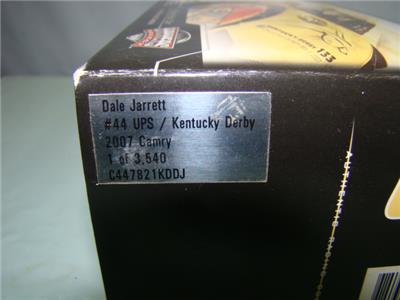 Offered for sale is a Dale Jarrett #44 UPS/Kentucky Derby 133, 2007 Camry. Limited Edition 1 of 3540. Kentucky Derby 133 at Churchill Downs on May 5, 2007. This 1:24 scale stock car is in the original box with dust bag and Styrofoam. The car and box are in good condition. Motorsports Authentics, Drivers Select, Limited Edition Adult Collectible.