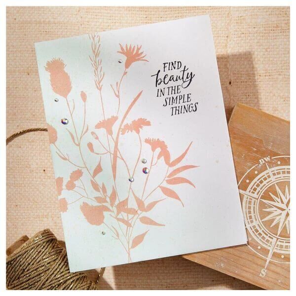 Field Notes Sentiments Clear Stamp Set is part of the Field Notes Collection and has four sentiments in the set. The Find Beauty in the Simple Things sentiment can fit into the magnifying glass in S2-411 Field Notes Tools Set. They are made in the USA with high-quality polymer for perfect impressions every time. Designed to be used with a clear stamp block.