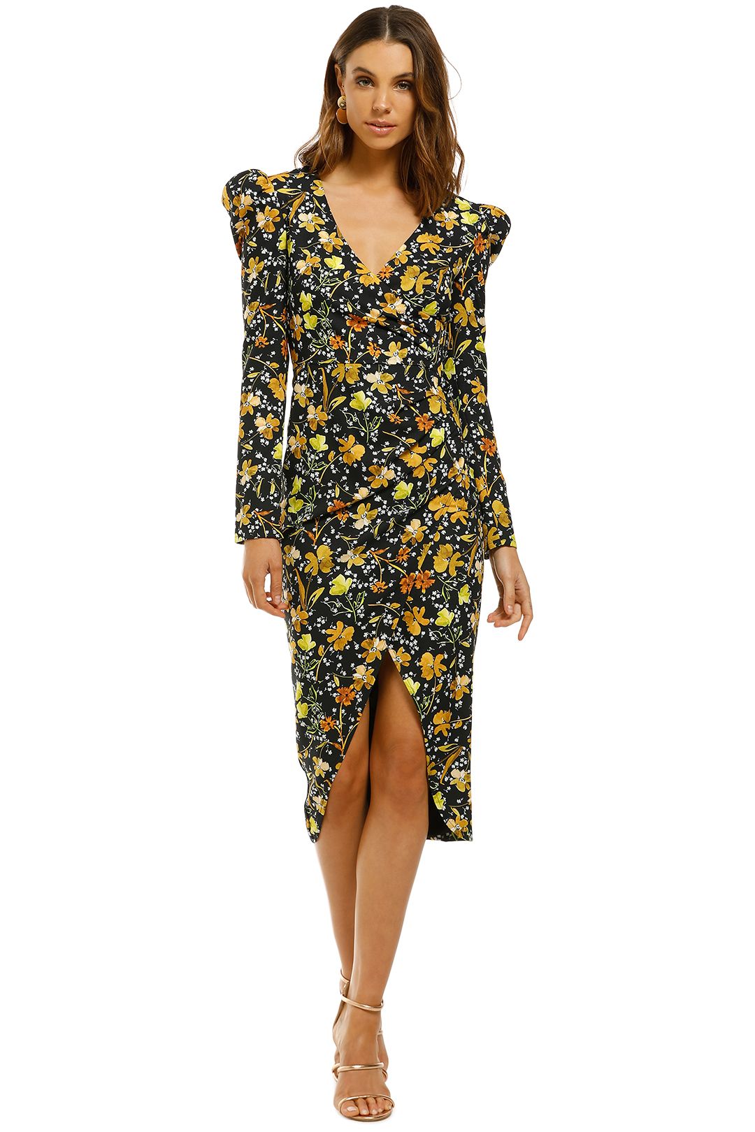 This By Johnny Bella Floral Tuck Wrap Midi Dress features a V neckline, long sleeves, exaggerated shoulders, gathers at the waist, wrap style skirt, front split and a centre back zipper.
