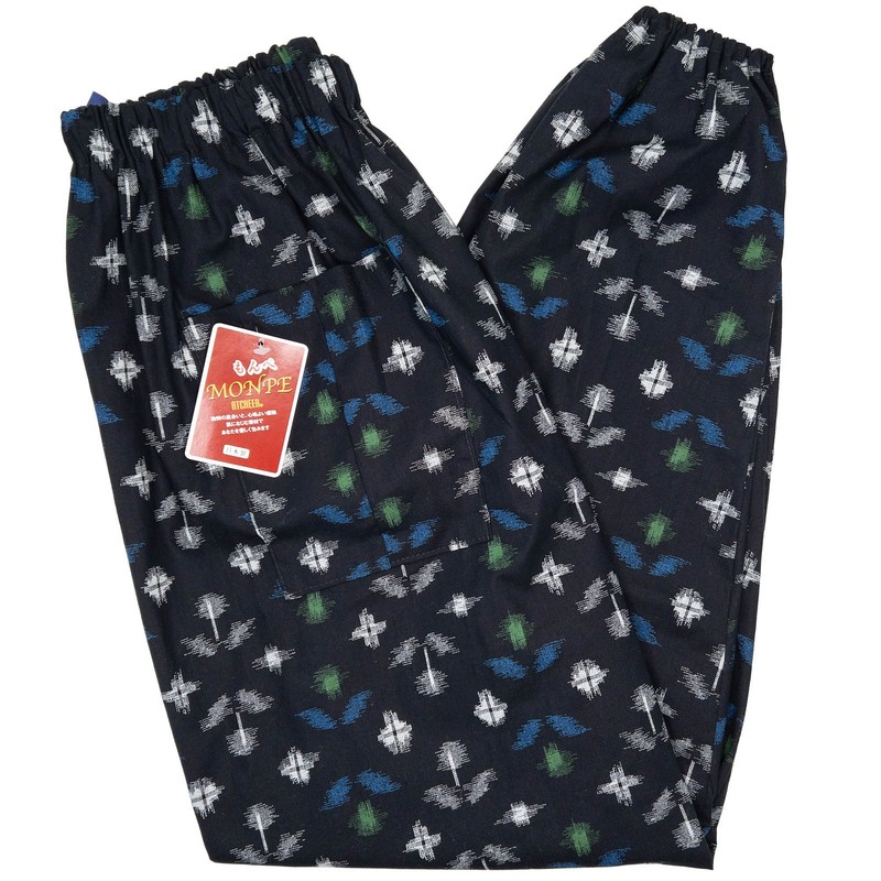 These monpe are a Japanese folk garment in a traditional cotton kasuri weave called “Kurume-Ori”. Monpe are a loose-fitting type of trouser worn for generations in Japan for housework, farming or gardening. The patterns are woven into the fabric - not printed. There is a single patch pocket on the right front and both the waist and cuffs are elasticized for comfort.