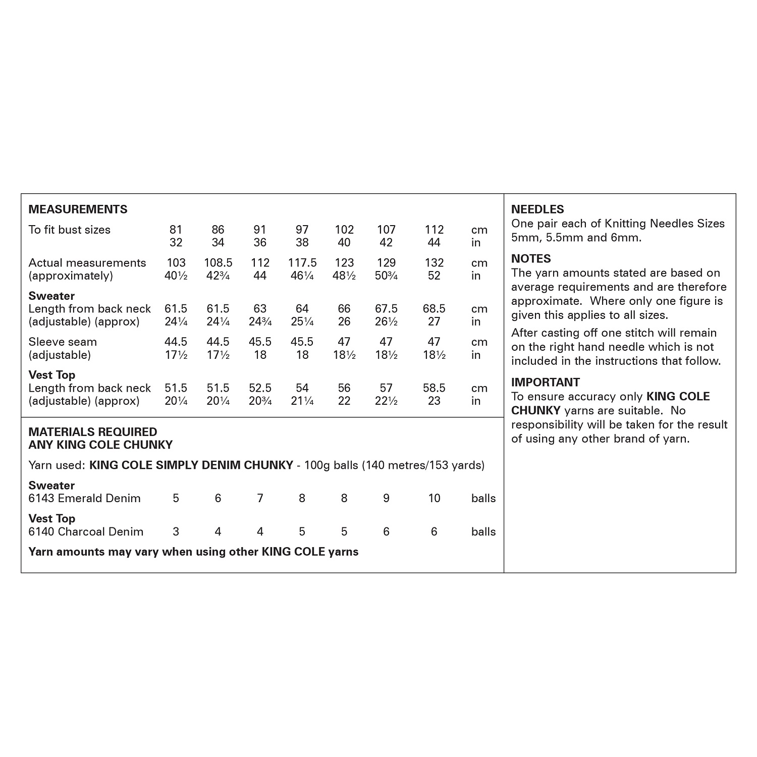 This easy knit chunky knitting pattern leaflet 6376 by King Cole will instruct you on how to create a ladies Sweater & Vest Top.