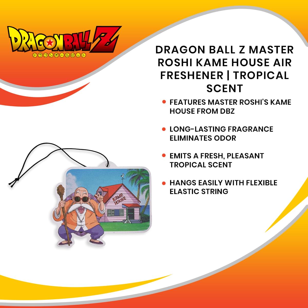 With an elastic string for easy hanging, this Master Roshi-approved air freshener is just what you need to show off your Dragon Ball fandom. Easily display this fun anime accessory in a variety of areas. Start eliminating bad odors from your car to your bathroom and other stuffy spaces.