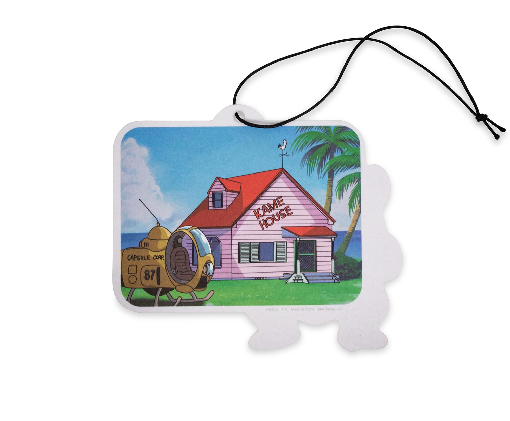 This colorful air freshener emits a sweet tropical scent… a smell that will make you feel like you're on an island retreat. The double-sided artwork features the martial arts master and his seaside home, complete with a Capsule Corporation aircraft.