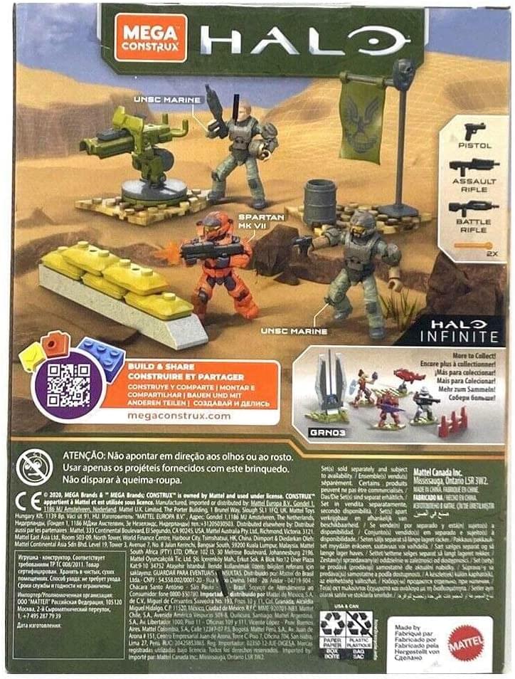 Halo Infinite inspired UNSC barricade building set with sandbag short wall, faction flag, and spinning turret. 3 highly collectible micro action figures include Spartan MK VII and 2 UNSC Marines, with authentic detail, 12 points of articulation, display stands and interchangeable accessories. Ideal for ages 8 and up, this building set features detailed authenticity to strengthen creative thinking skills.