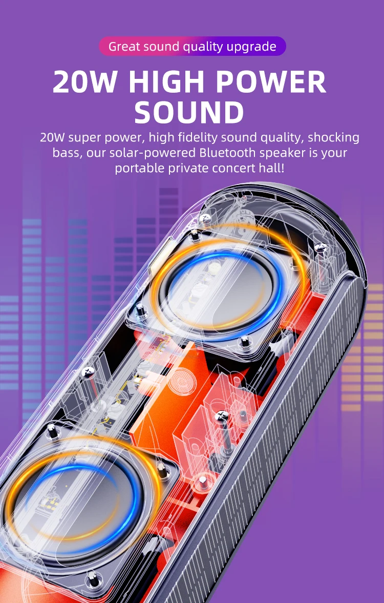 Long Battery Life & Portable: With a large capacity of 5000mAh, the ABFOCE golf cart speaker provides up to 30 hours of playtime, You can play music anytime, anywhere, without worrying about running out of battery. It is also a lightweight and portable solar speaker, measuring 7.8in*2.9in*2.9in and weighing only 1.2ib