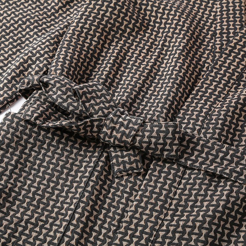 Design: Classic wrap style with waist belt and dual pockets