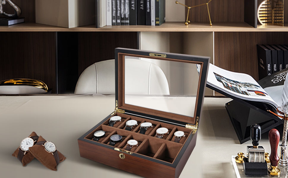 Safeguard and display your watch collection in timeless elegance. Crafted with engineered wood featuring an exquisite wood-grain finish, this case protects against dust while showcasing timepieces through crystal-clear viewing glass.