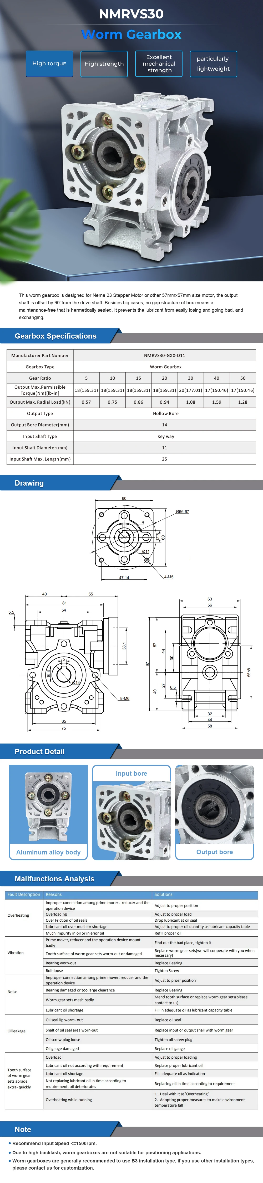 This worm gearbox is designed for Nema 23 Stepper Motor or other 57mmx57mm size motor, the output shaft is offset by 90° from the drive shaft. The advantage for this gearbox is efficiency and self-locking. Besides big cases, no gap structure of box means a maintenance- free that is hermetically sealed. It prevents the lubricant from easily losing and going bad, and exchanging.