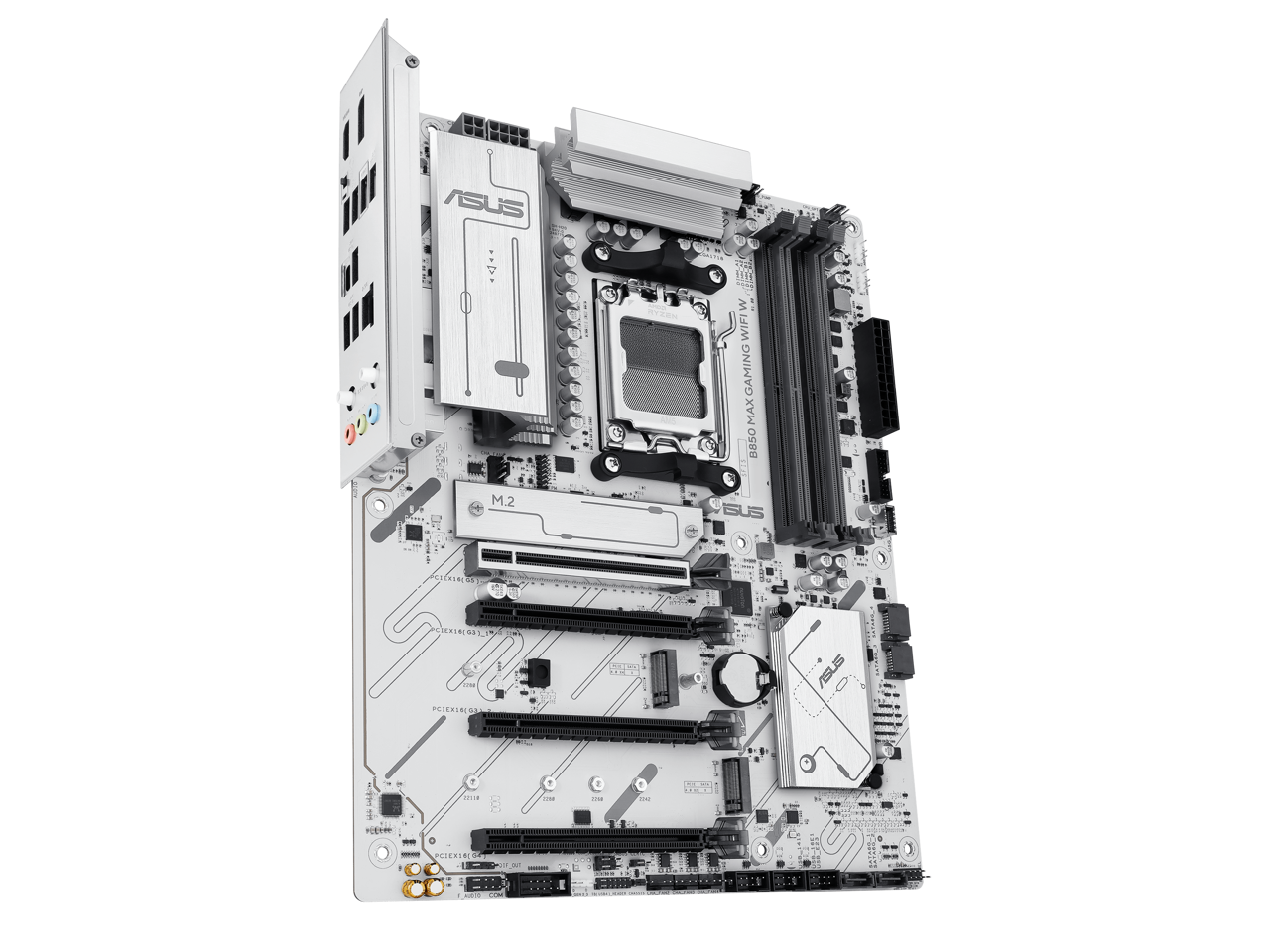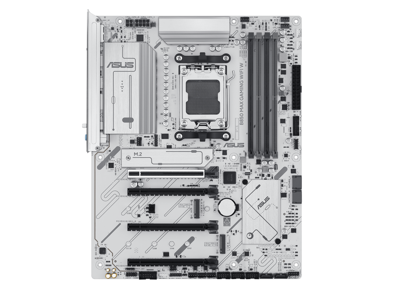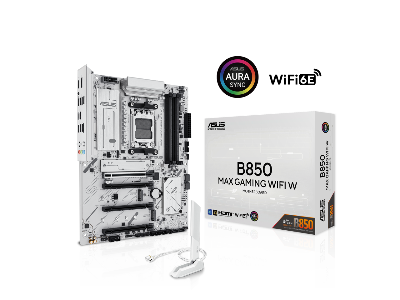 ASUS B850 MAX GAMING WIFI W - AMD AM5 ATX Motherboard, White PCB, DDR5, PCIe 5.0 Ready, 3x M.2, Wi-Fi 6E, 2.5Gb LAN, USB 10Gbps Type-C, DisplayPort, HDMI, BIOS FlashBack, Aura Sync, ASUS AI Advisor