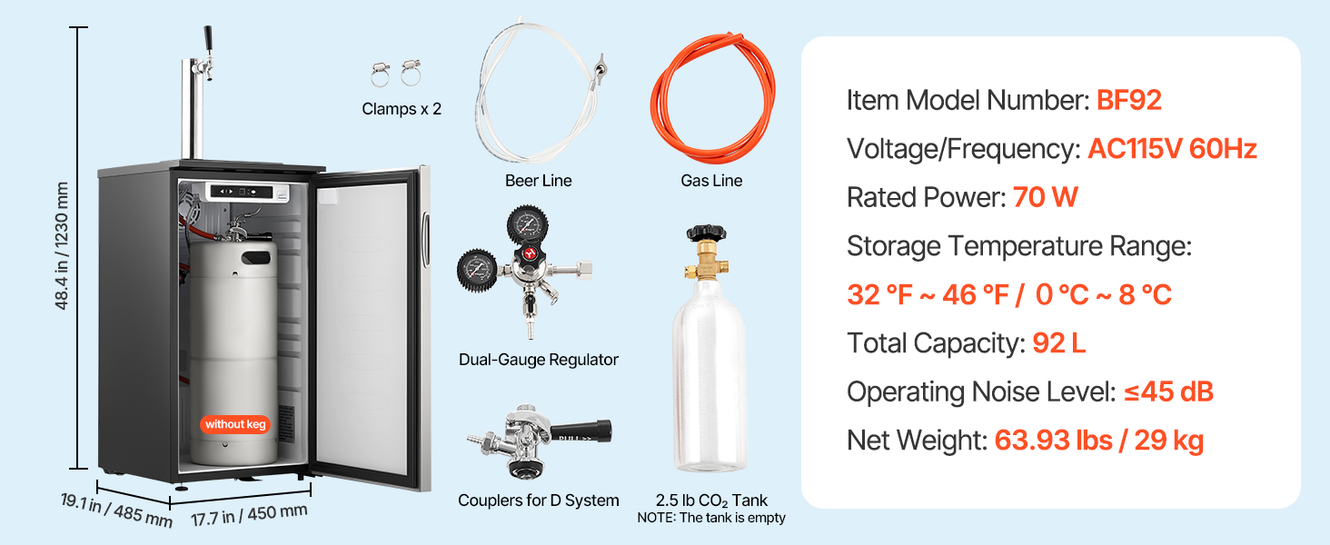 - Complete Pro-Level Kit: This kegerator includes a stainless steel dual-tap beer tower, dual-gauge single-valve regulator, D-type coupler, and a 5 lbs CO₂ tank. All connectors are reinforced for durability, ensuring no-leaking, steady dispensing even with frequent use