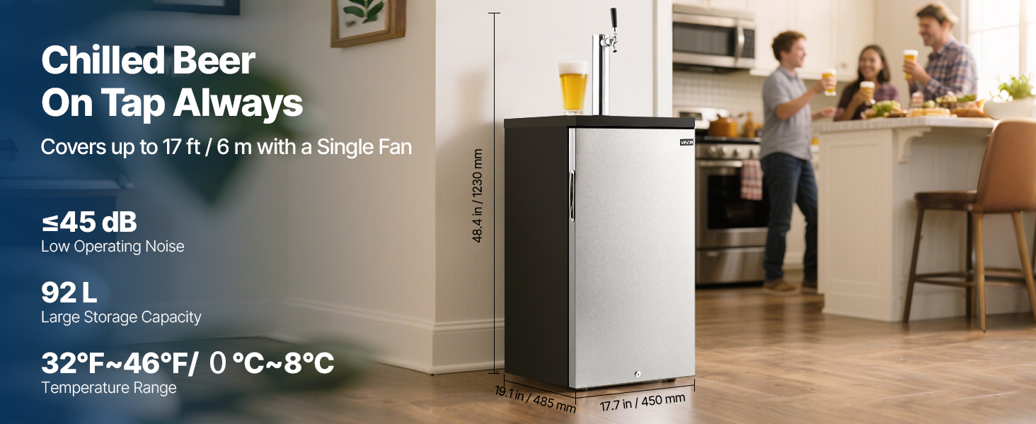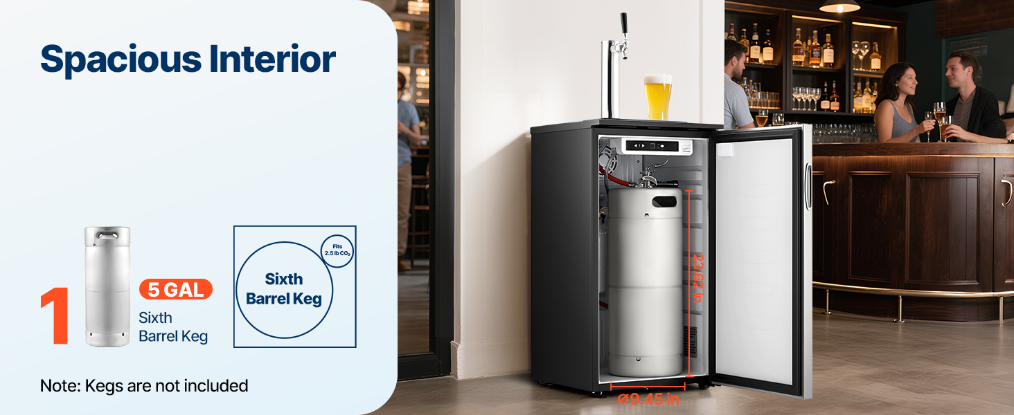 Accommodates 1 sixth-barrel keg and a 5 lbs CO₂ tank, offering consistent cooling, steady beer output, and flexible usage across various settings—ideal for home entertaining or micro commercial setups.