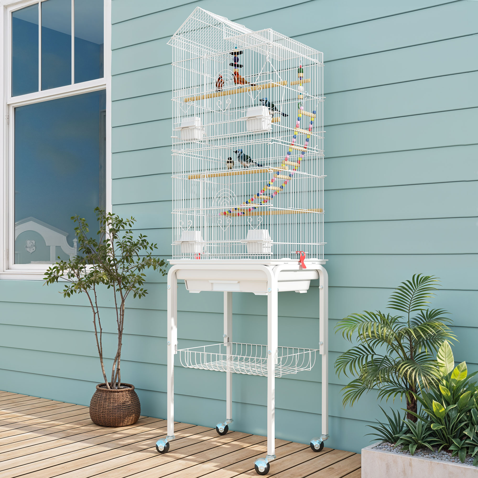 With entertaining perches and ample space, this cage ensures a comfortable home for small to medium birds. Its portable design and 360° swivel wheels allow for effortless mobility. Dimensions: 17''L × 14''W × 62''H.