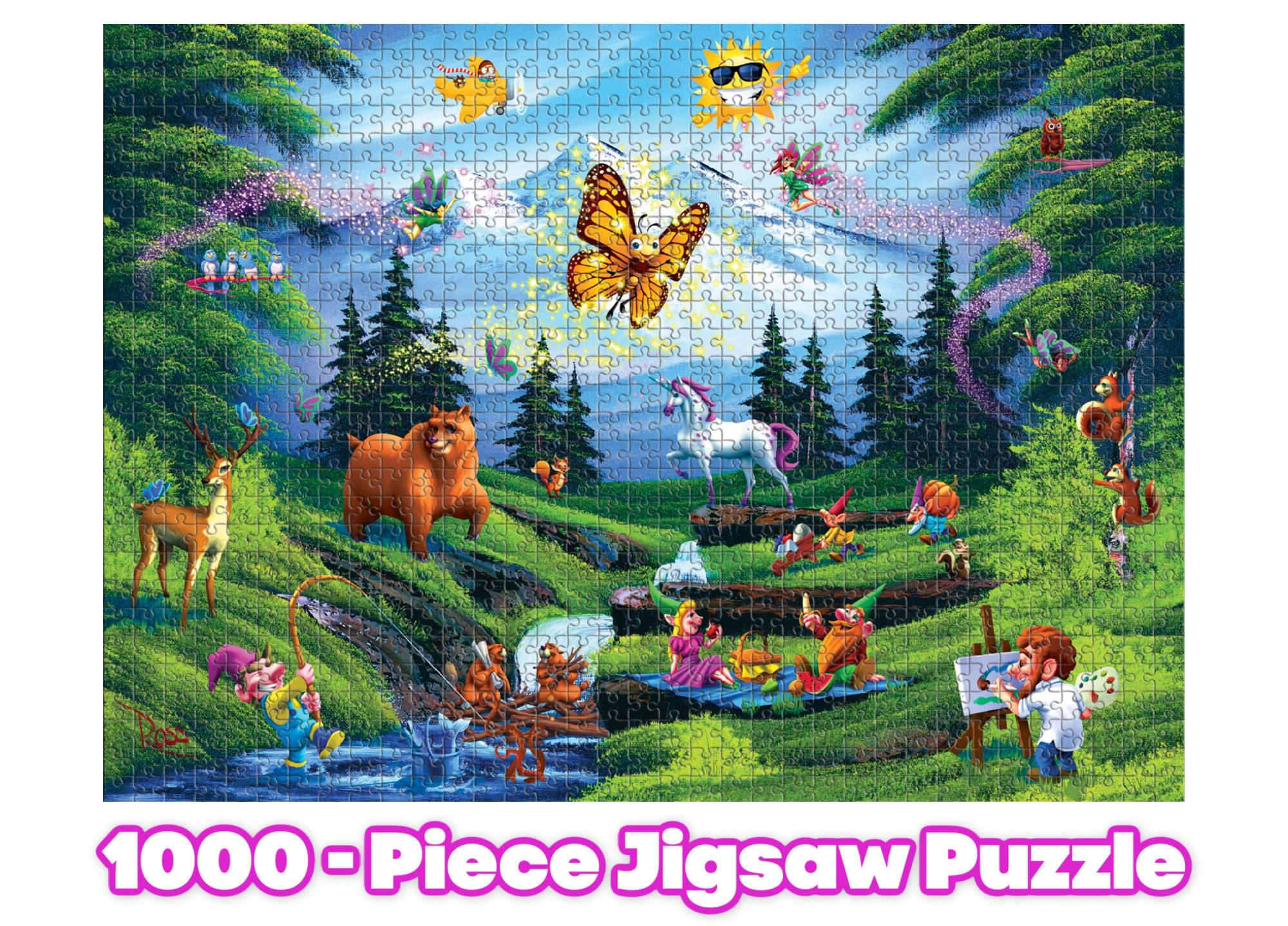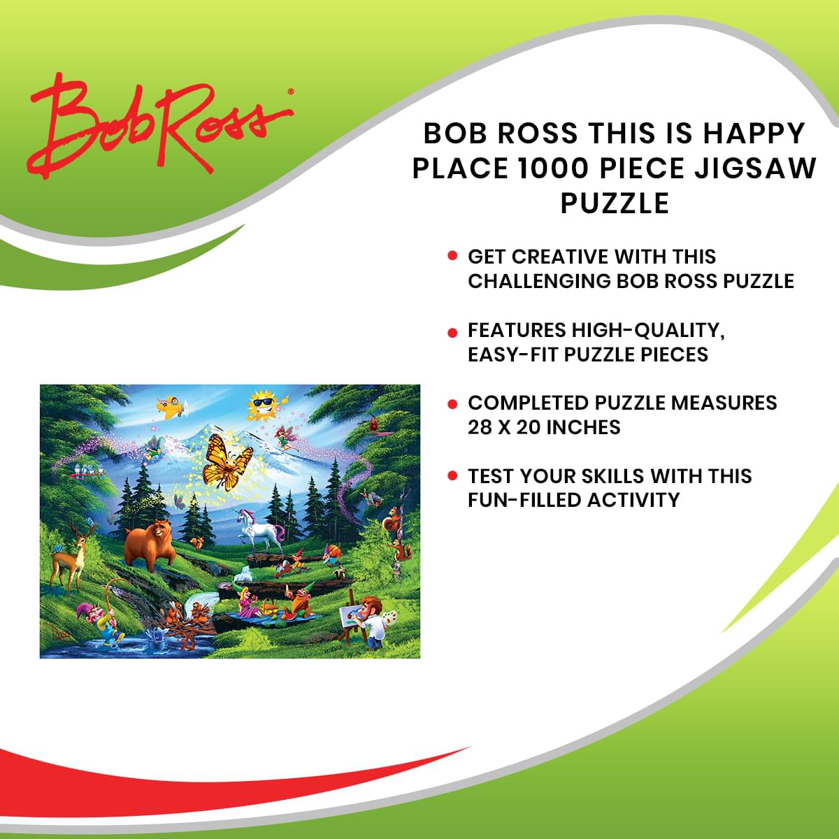 Unlock the joy of painting with this Bob Ross This Is Happy Place 1000-Piece Puzzle. Measuring 28 x 20 inches, the completed jigsaw puzzle depicts a fantasy-style landscape that is inspired by the legendary artist and his serene nature paintings. Adding an extra imaginative touch, the scenic puzzle image features fairies, trolls, butterflies, wildlife, and woodland creatures roaming across the mountainous landscape. A cartoon-style Bob Ross can also be spotted in the assembled image, where he can be seen smiling as he paints on his canvas.