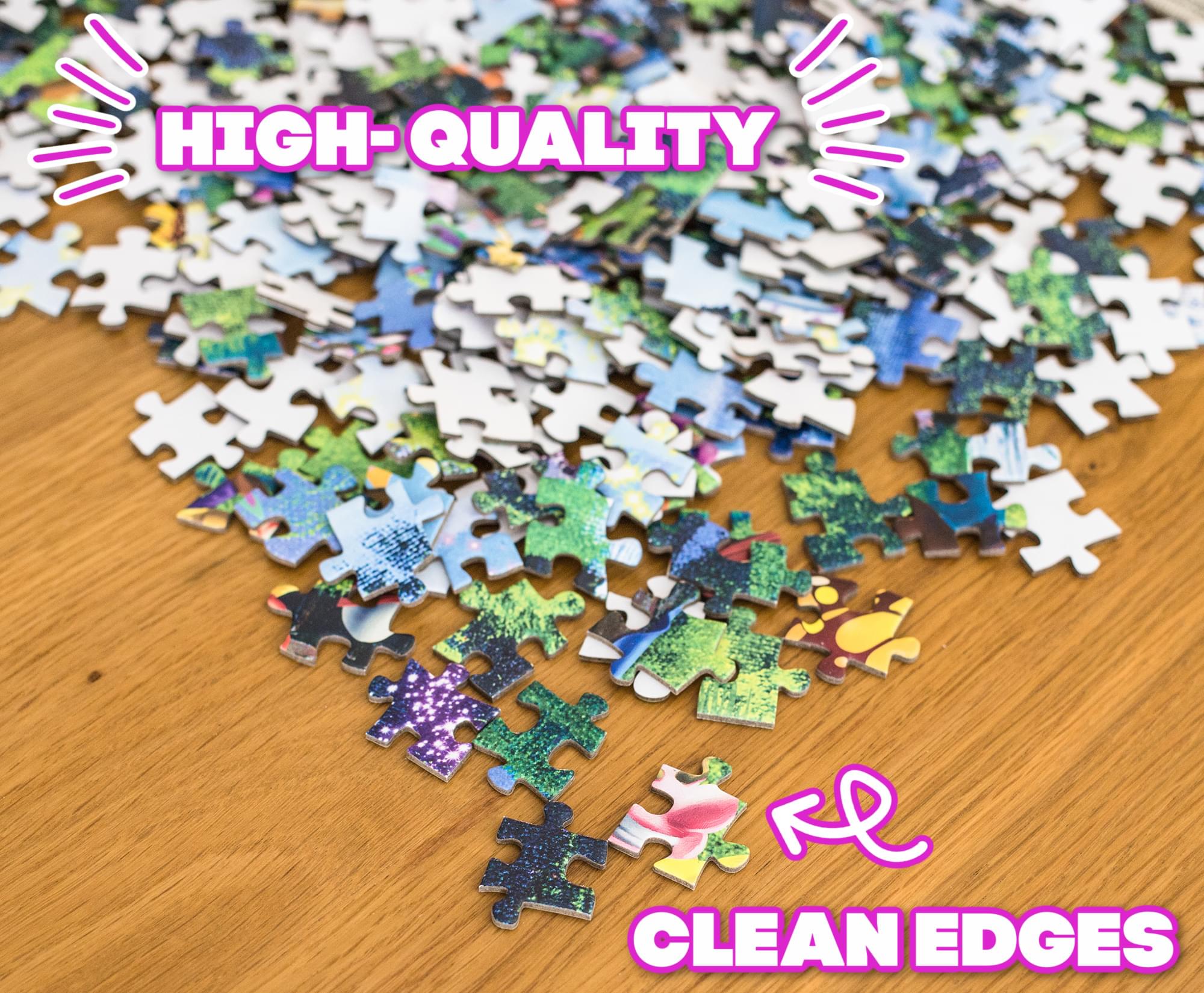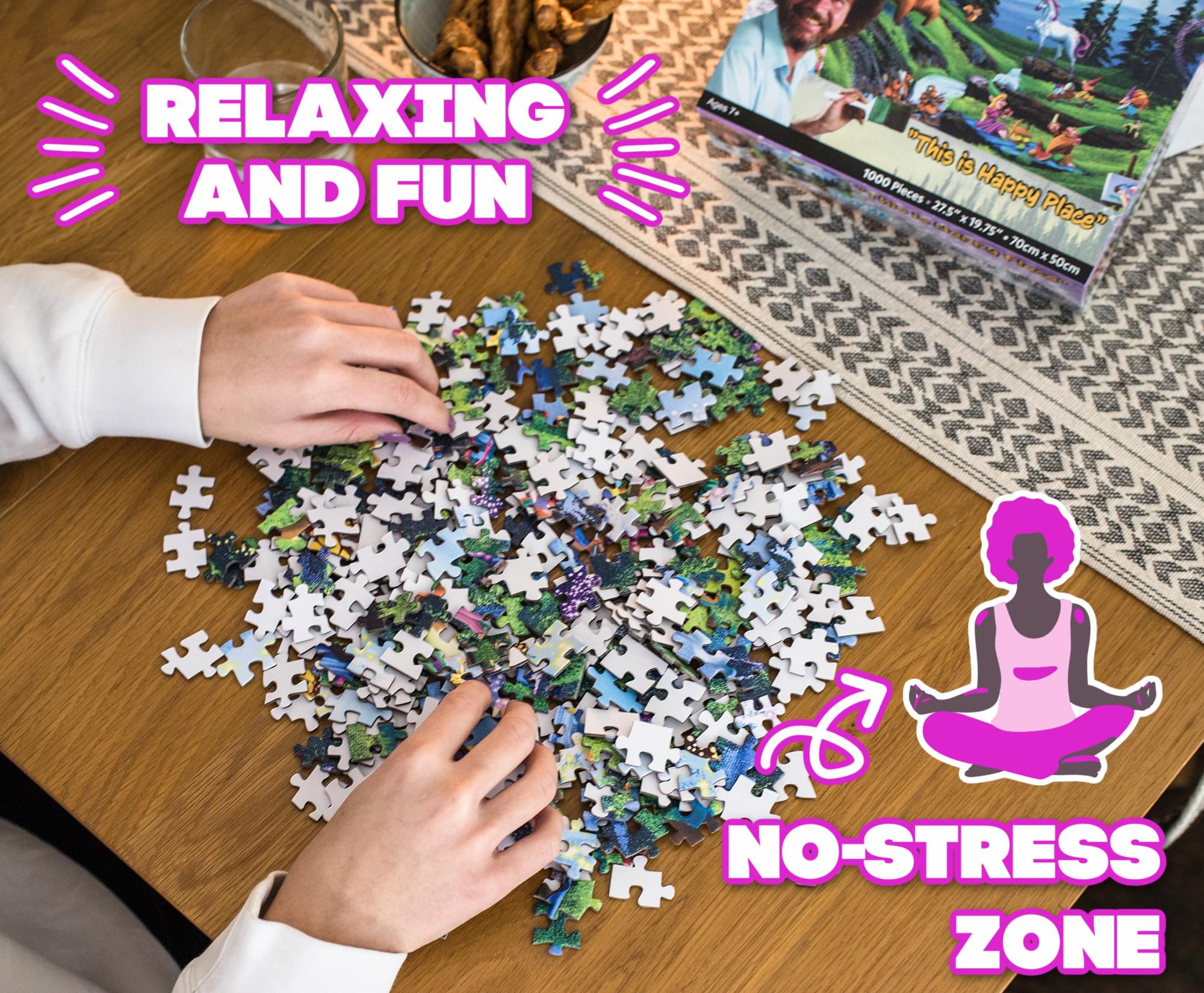 Specially made from 100% recycled puzzle board material, the premium construction provides a top-quality building experience. The precision-cut jigsaw pieces are designed to snap easily into place, ensuring a satisfying and seamless interlocking fit. Have fun exercising your imagination as you assemble this challenging 1000-piece puzzle, which makes for a fun and crafty display piece once finished. Host a family game night or make it a personal challenge to complete this Bob Ross puzzle solo. Always remember, there's nothing wrong with having a tree as a friend.