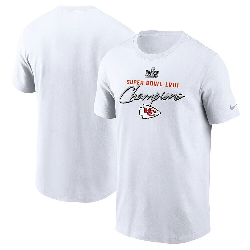 Celebrate the Kansas City Chiefs' Super Bowl LVIII victory with the Men's Nike White Kansas City Chiefs Super Bowl LVIII Champions Classic T-Shirt. This commemorative tee features screen-printed graphics that proudly display the Chiefs' iconic logo and Super Bowl LVIII Champions title. Made from soft cotton, this t-shirt offers comfort and breathability, making it perfect for game day or any day you want to show your support for the Kansas City Chiefs.Celebrate the Kansas City Chiefs' Super Bowl LVIII victory with the Men's Nike White Kansas City Chiefs Super Bowl LVIII Champions Classic T-Shirt. This commemorative tee features screen-printed graphics that proudly display the Chiefs' iconic logo and Super Bowl LVIII Champions title. Made from soft cotton, this t-shirt offers comfort and breathability, making it perfect for game day or any day you want to show your support for the Kansas City Chiefs.PRODUCT FEATURESOfficially licensedMachine wash, tumble dry lowBrand: NikeShort sleeveImportedCrew neckMaterial