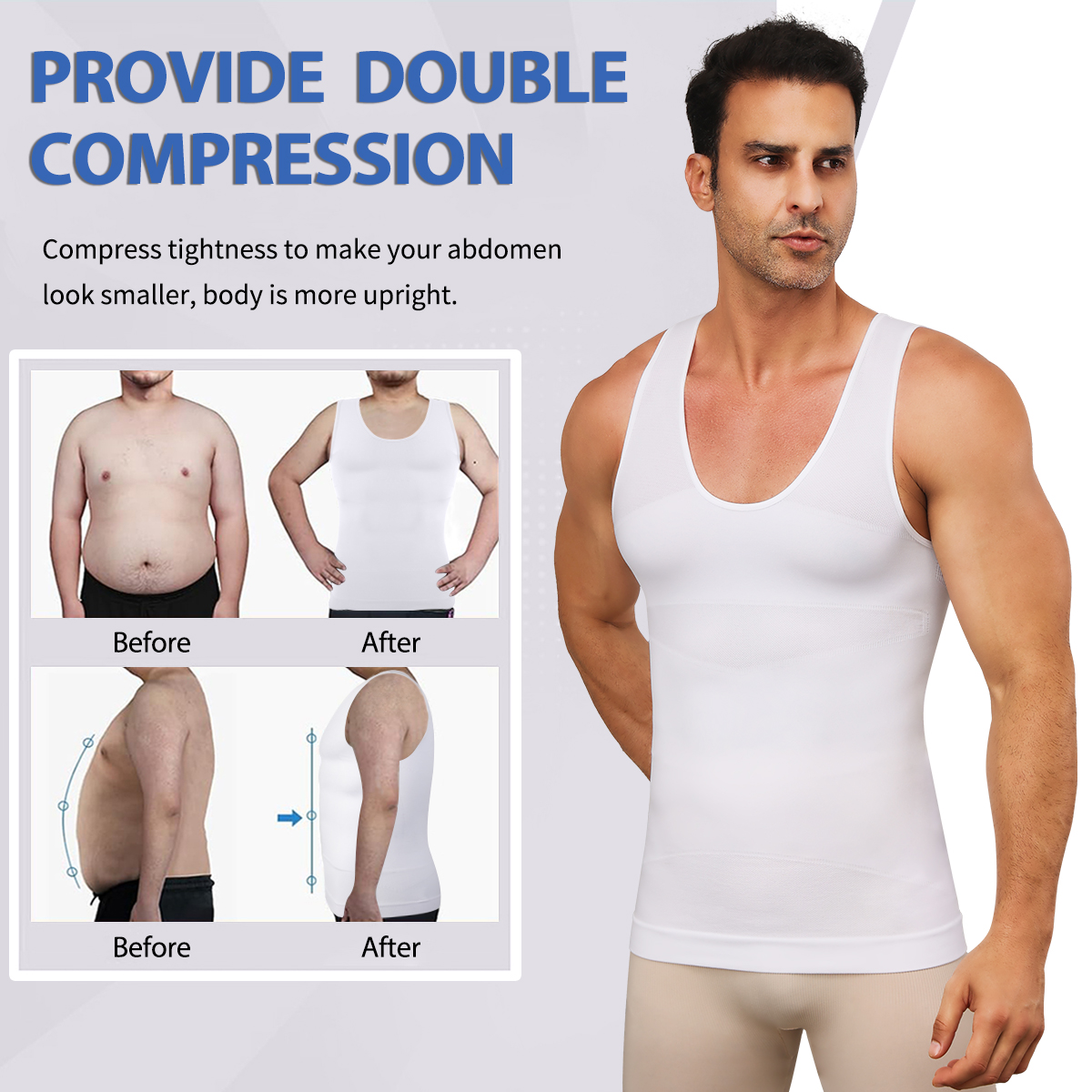 Compress and Instantly Abdomen Slim:This compression shirt works well with putting the loose skin in a tight firm place which helps you get rid of unwanted fat rolls, lumps and muffin tops without causing any discomfort, flattening your chest and abdomen,not to mention the back support and overall posture.Get your self-confidence back.