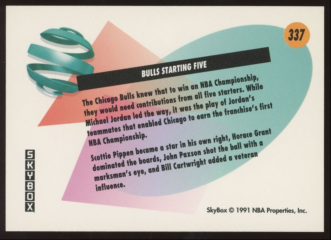 | Description: | Michael Jordan | | Category: | Basketball | | Year: | 1991 | | Product: | SkyBox | | Team: | Chicago Bulls | | Card Number: | 337 | | Dimensions: | 3½" x 2½" | | SKU: | Row AQ |