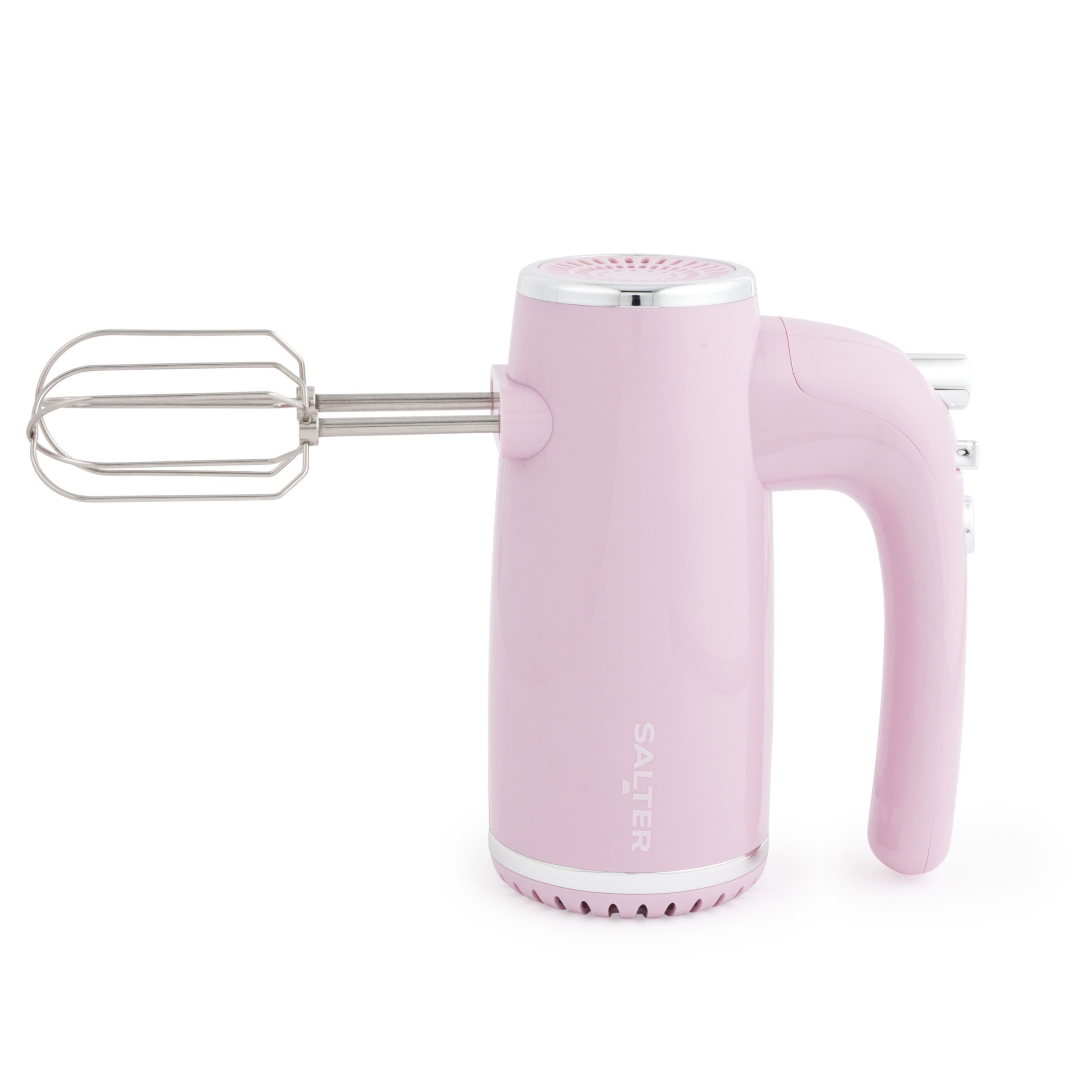 Whip up airy meringues or silky-smooth cake batter with the Salter Pink Retro Hand Mixer. This electric whisk features a powerful 400W motor, 5 speed settings and a turbo function giving you full control over your cooking! It comes with XL chrome beaters and dough hooks, perfect for whipping, beating, or kneading. Plus, the easy eject function lets you switch accessories hassle-free. This mixer not only handles all your baking needs but also adds a chic, vintage touch to your kitchen.
