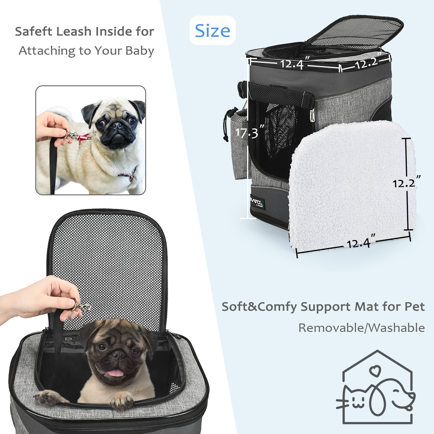 ● This large size soft sided pet carrier backpack measures 17.3"H x12.4"L x12.2"W, Easily fits cats, small dogs, and most other small/medium sized pets (up to 18 lbs). Convenient for you to carry your pet out for traveling, riding, walking, sightseeing, camping, hiking or trips
