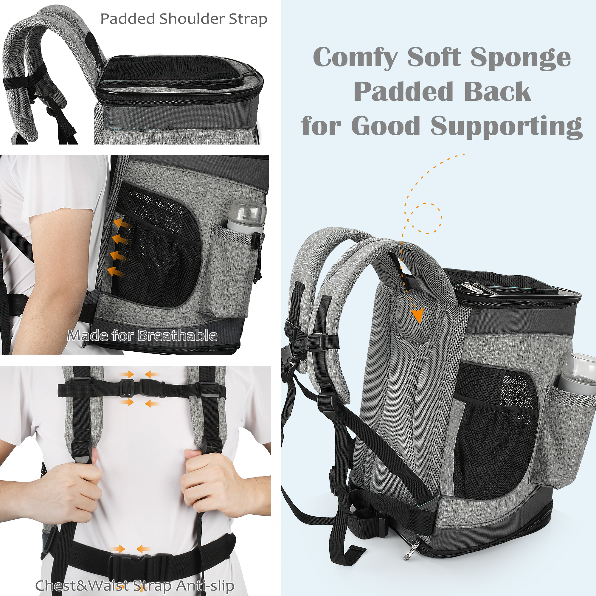 ● COMFORT FIT, AND CONVENIENCE PET BAG- Featured extra thick padded back & padded shoulder strap makes comfortable to wear. Coming with a adjustable both waist & chest strap which helps to give you extra suppor. side pouches and a front pocket to store essential pet supplies.