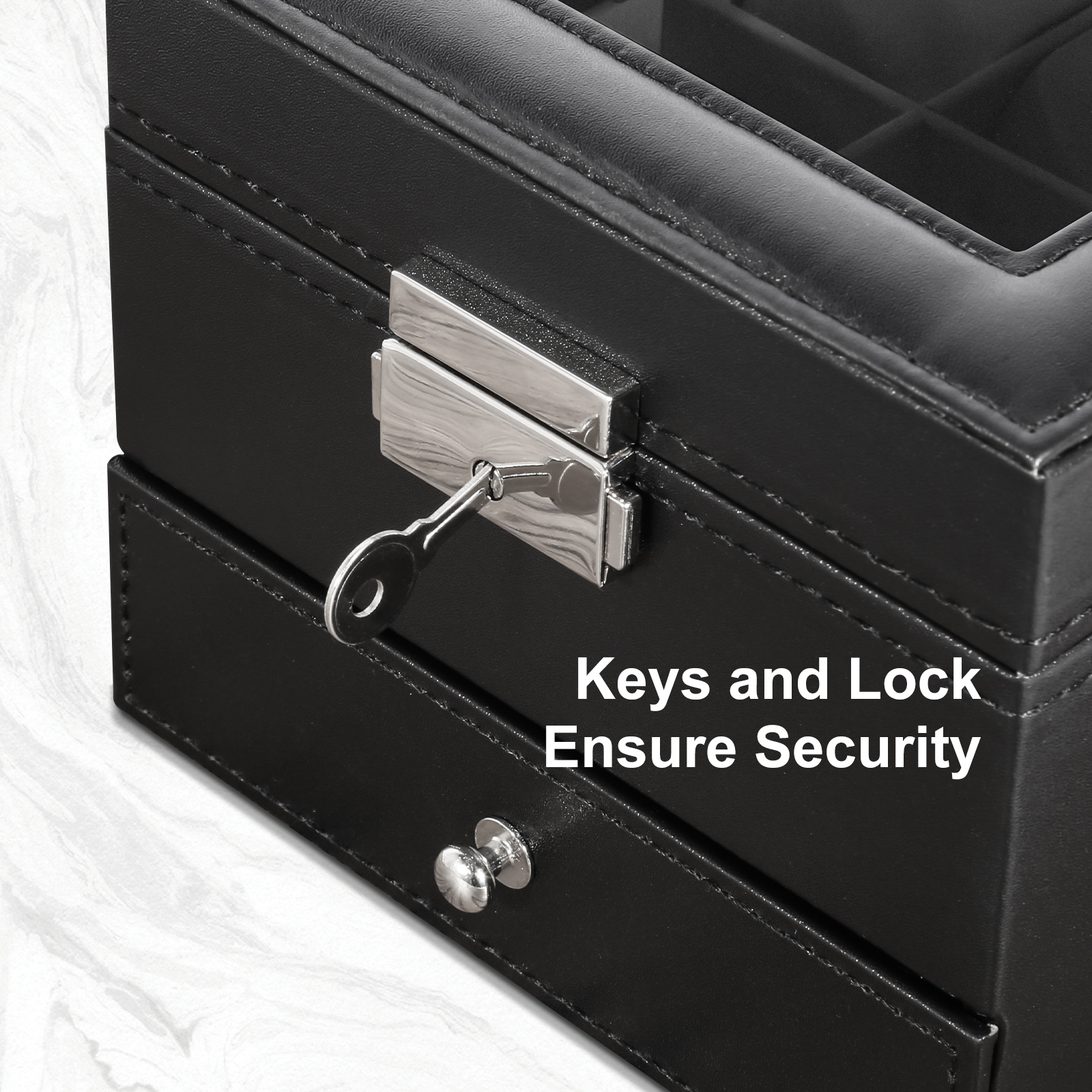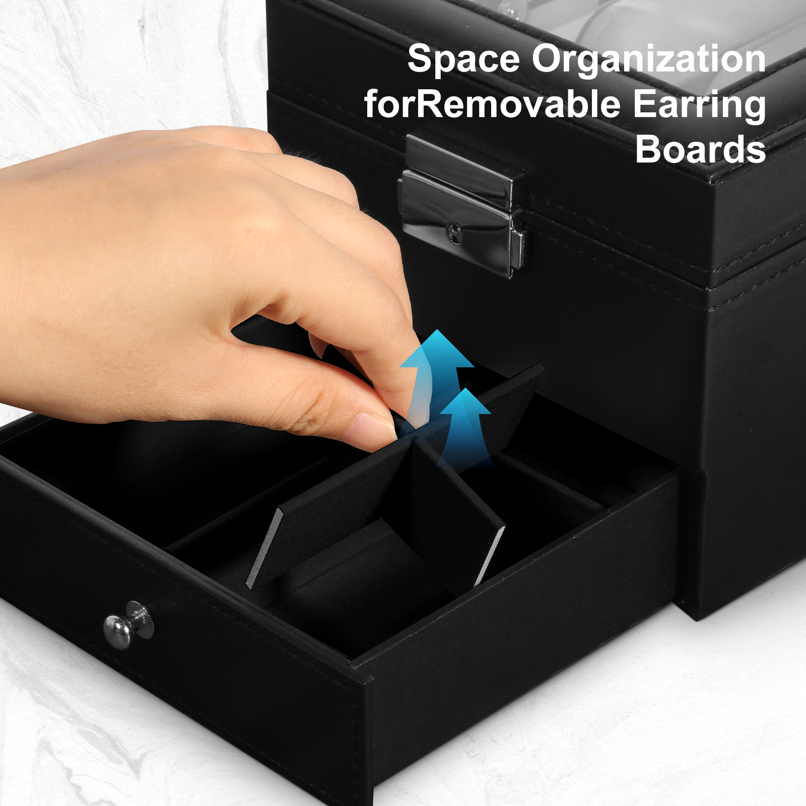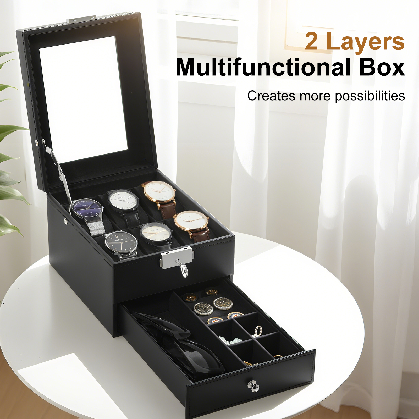 Interchangeable velvet cushions adjust to fit any watch size, preventing scratches and ensuring a perfect fit. A removable top tray securely stores jewelry, sunglasses, and other accessories.