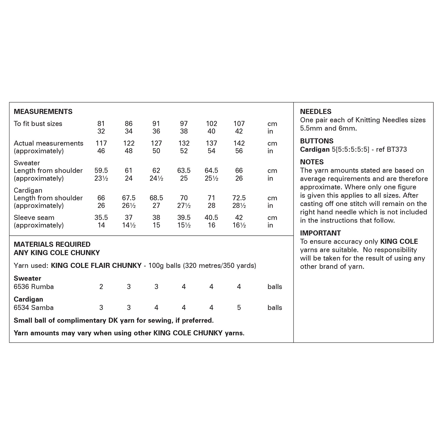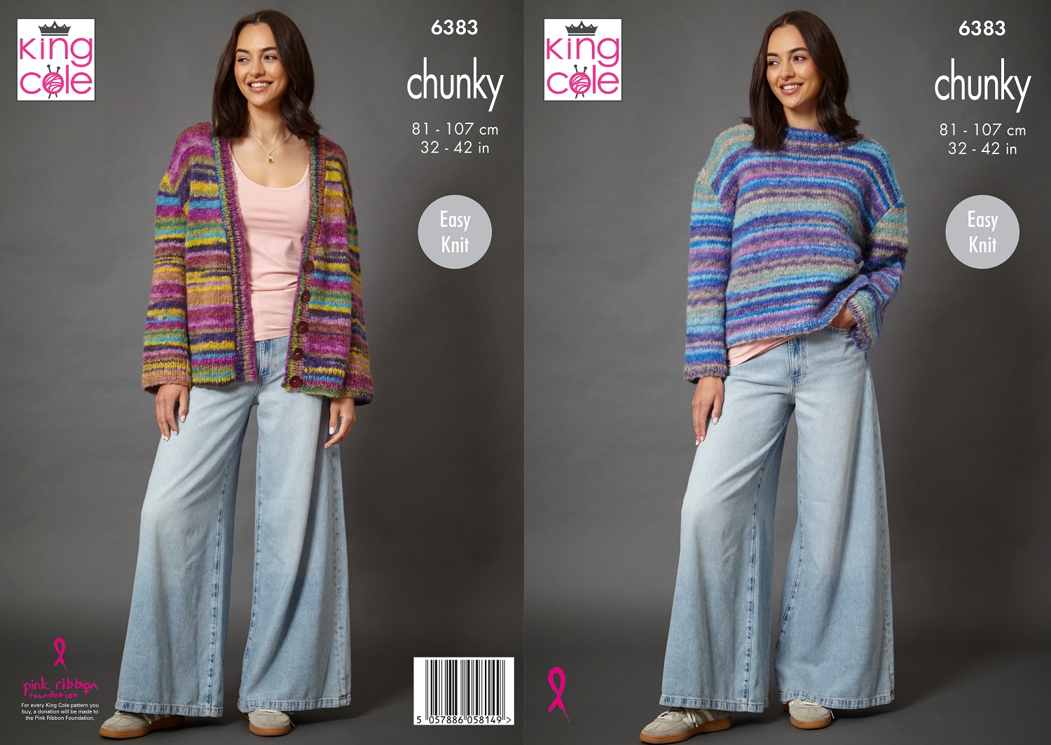 This chunky, easy knit knitting pattern leaflet 6383 by King Cole will instruct you on how to create a ladies sweater & cardigan.