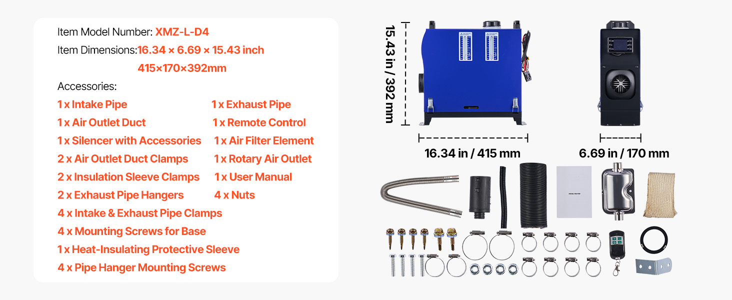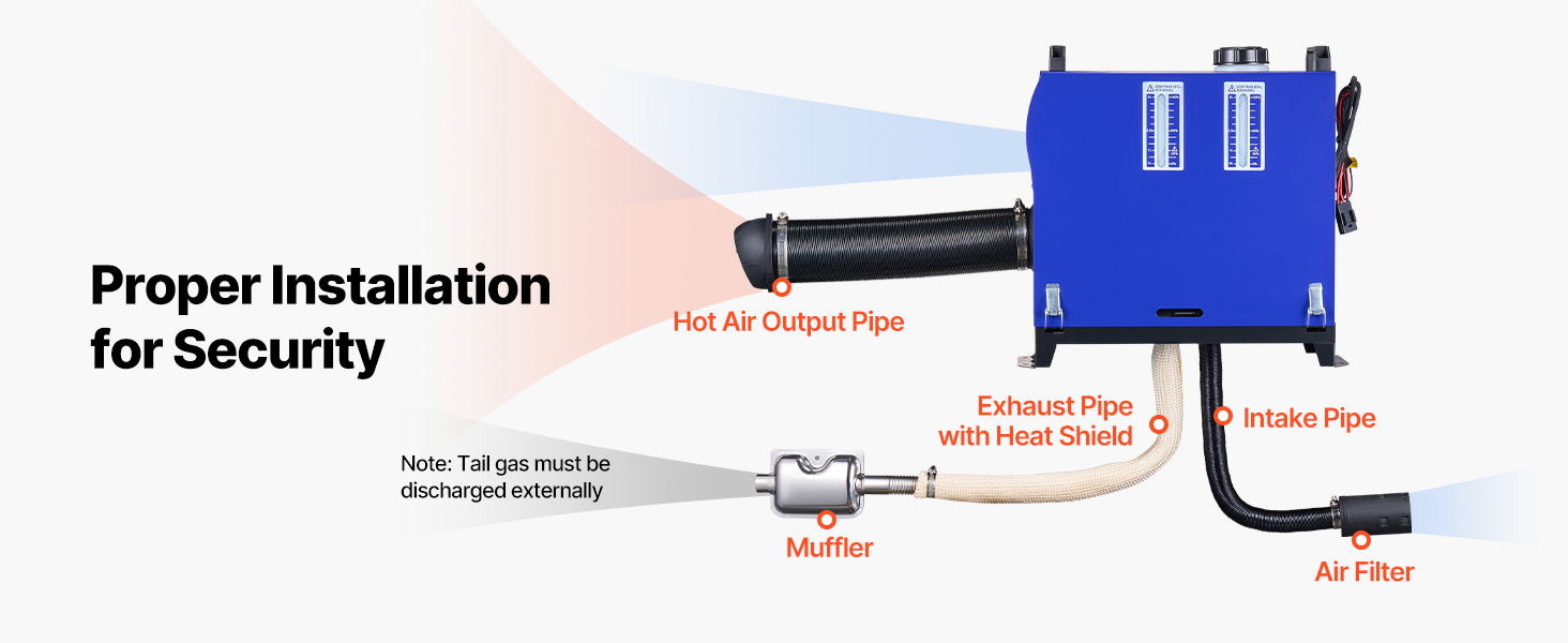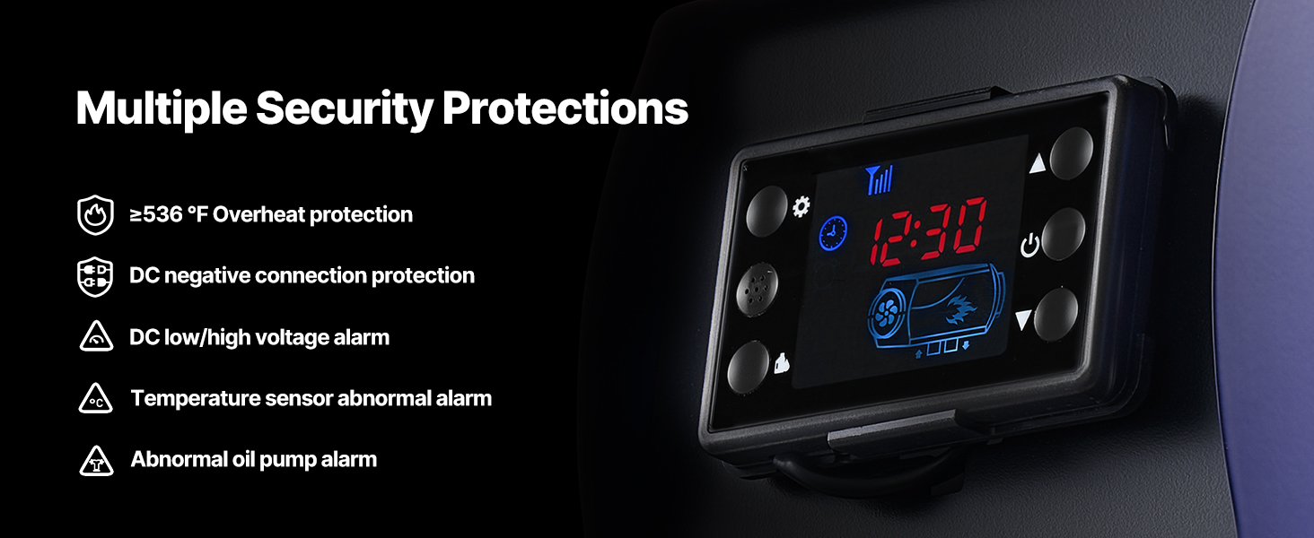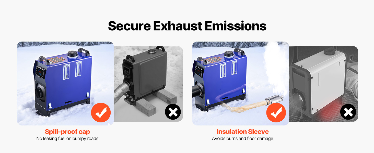 - Sicherheitsmerkmale: Der Diesel-Lufterhitzer ist mit einer Wärmemanschette für das Abgasrohr ausgestattet, die das Risiko von Schäden am Boden minimiert. Der dicht schließende Tankdeckel sorgt für eine sichere Nutzung über längere Zeiträume. Zu den eingebauten Schutzmechanismen zählen eine automatische Abschaltung bei Überhitzung (≥ 536 ℉ / 280 ℃), ein Schutz gegen Verpolung sowie ein Überspannungsschutz.