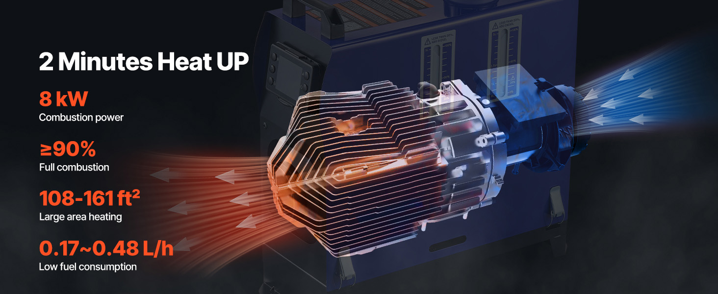 Der Aluminium-Heizkörper gewährleistet eine ausgezeichnete Wärmeübertragung, wodurch der Dieselheizer die Umgebungsluft zügig erwärmt und die Wärme effizient verteilt.