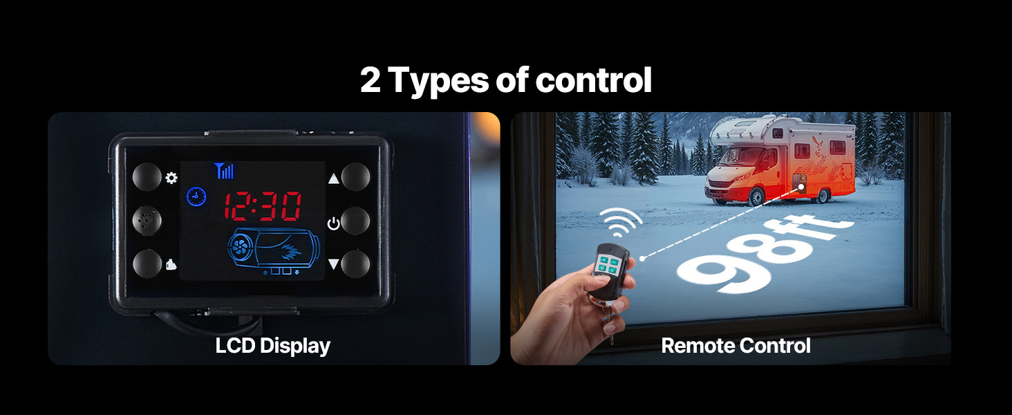 - Zwei Steuerungsmöglichkeiten: Der Diesel-Heizer ermöglicht eine einfache Temperaturregelung (46,4–96,8 ℉ / 8–36 °C) entweder direkt über den LCD-Bildschirm oder bequem per Fernbedienung aus einer Entfernung von bis zu 30 Metern. Ideal zum Vorwärmen vor der Fahrt, um Kaltstarts zu vermeiden und den Energieverbrauch zu senken.