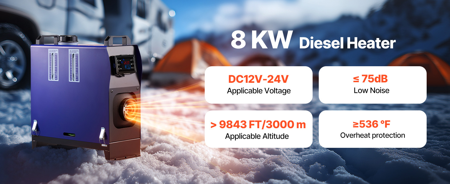 Dieser 8-kW-Diesel-Lufterhitzer ist kompatibel mit 12 V und 24 V, wodurch er sich hervorragend für Wohnmobile, Lastwagen, SUVs, Campervans und andere Nutzfahrzeuge eignet. Selbst bei niedrigen Temperaturen liefert er schnelle und zuverlässige Wärme und wurde speziell für die effektive Beheizung größerer Räume entwickelt. Er bietet eine starke Heizleistung bei gleichzeitig sparsamem Kraftstoffverbrauch.
