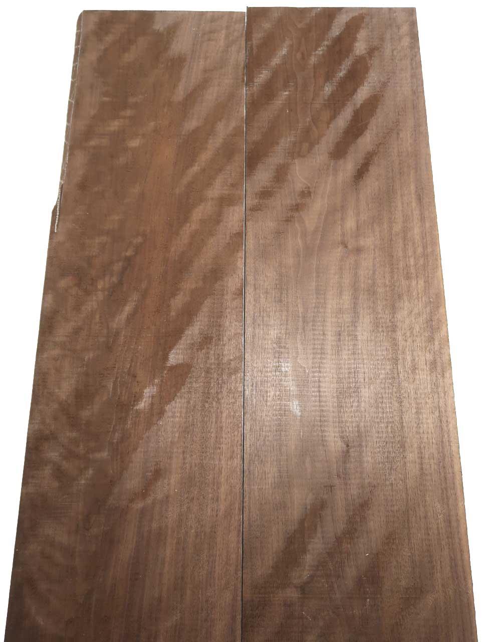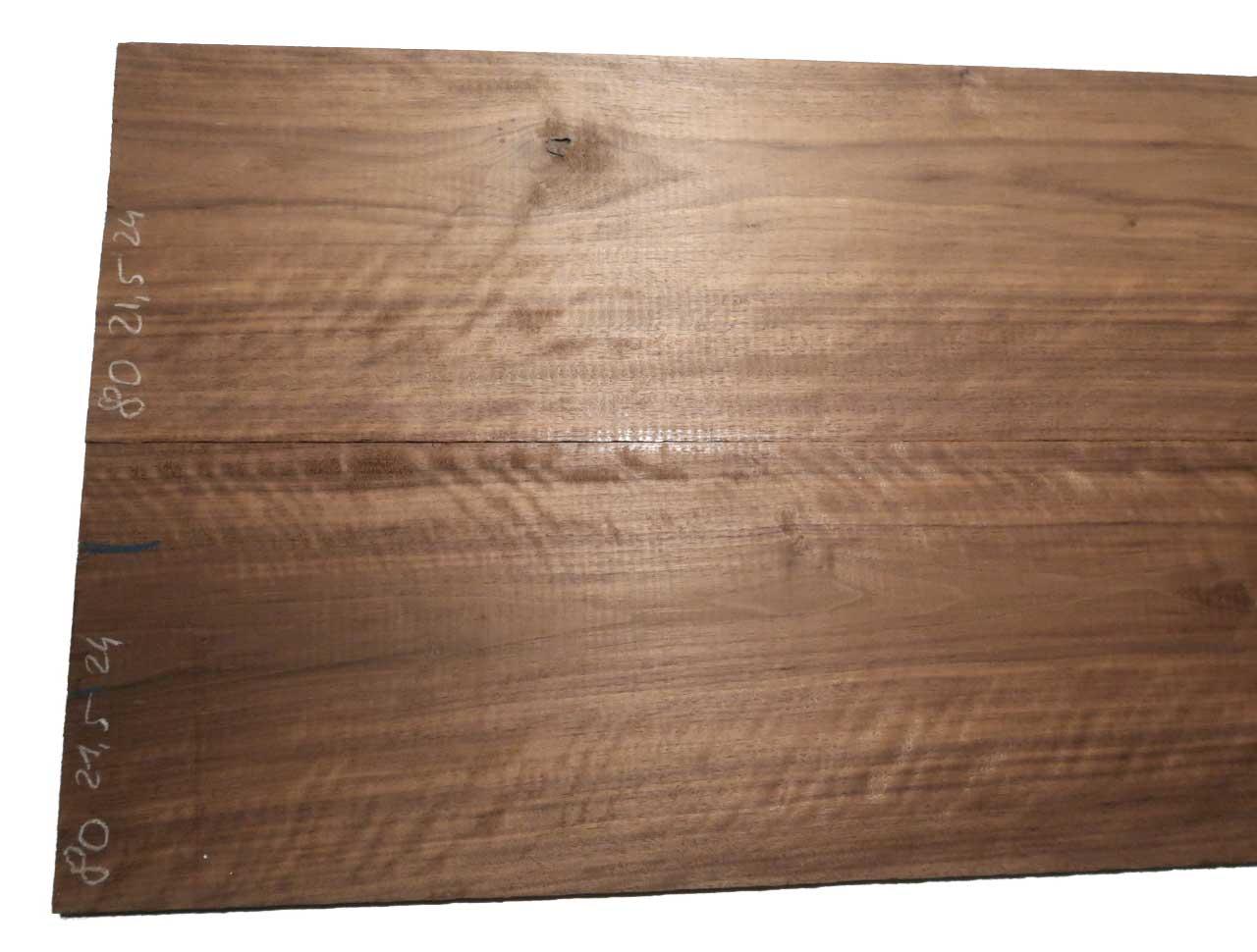 Hierbei handelt es sich um geflammtes / geriegeltes Nussbaum Holz, was eine wunderschöne Sonderform des normales Nussbaumholzes ist. Mit seiner kräftigen grau- bis schokoladenbraunen Farbe und seiner deutlich gestreiften bzw. gefladerten Struktur ist der amerikanische Nussbaum ein sehr begehrtes und als hochwertig betrachtetes Möbelholz. Geriegelter Nussbaum ist eine gefragte Wuchsvariante der regulären Ware mit hoch dekorativem Charakter. Dieser wird bestimmt durch ein wellenförmig bewegtes Erscheinungsbild sowie durch mehr oder weniger regelmäßig und stark ausgeprägte Streifen, die quer zum Faserverlauf ausgerichtet sind.