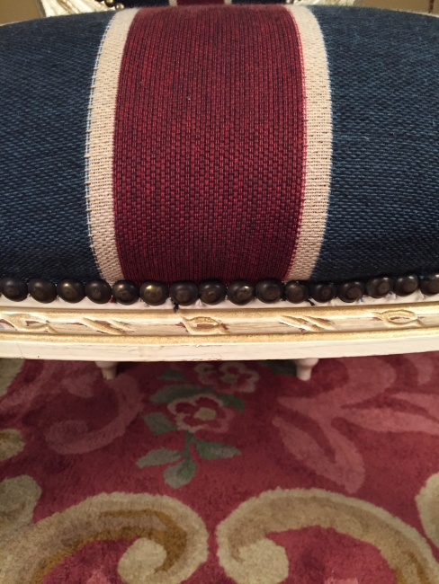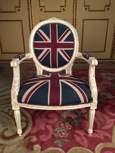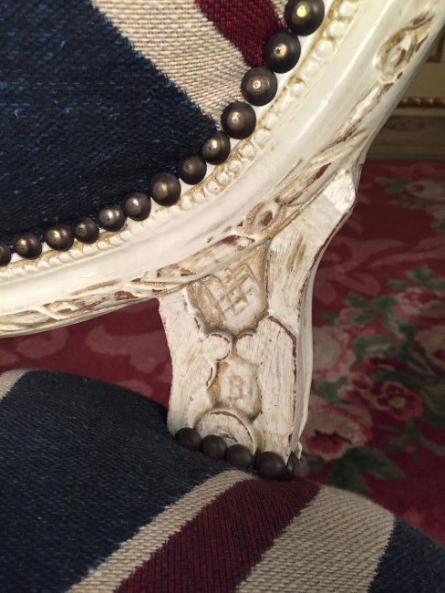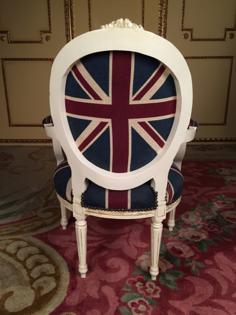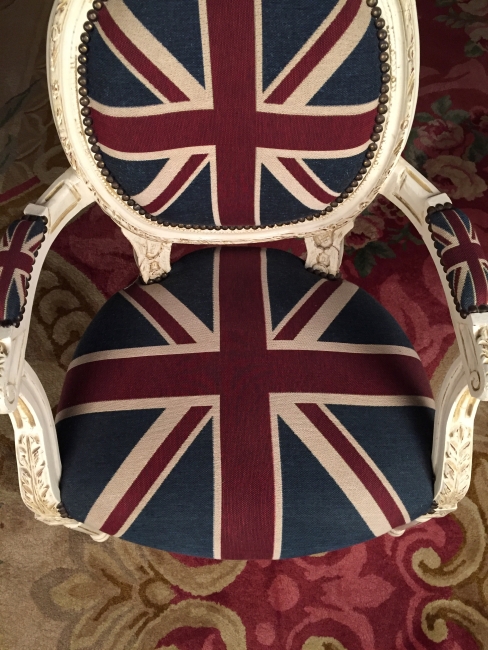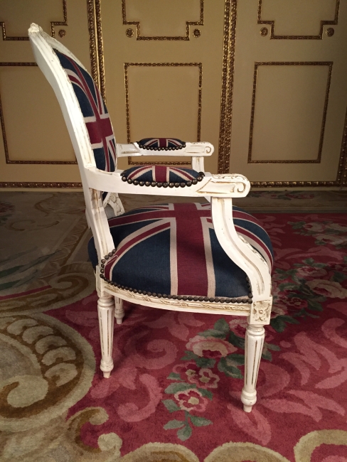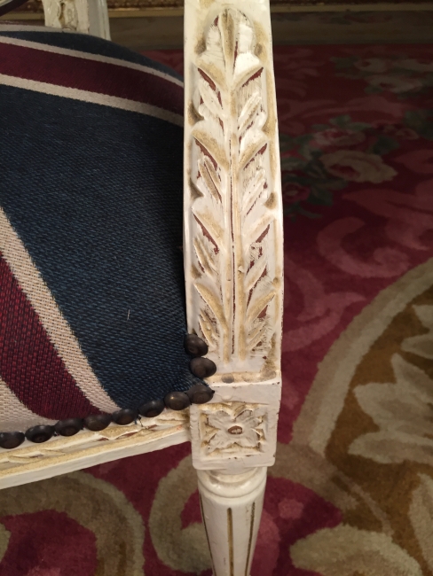 Fauteuil élégant de style Louis Seize Grande-BretagneBois de hêtre massif, sculpté et peint en blanc. Jambes fuselées. Assise et dossier larges et rembourrés. La chaise est recouverte d'un tissu de haute qualité.