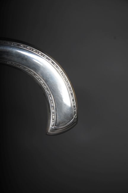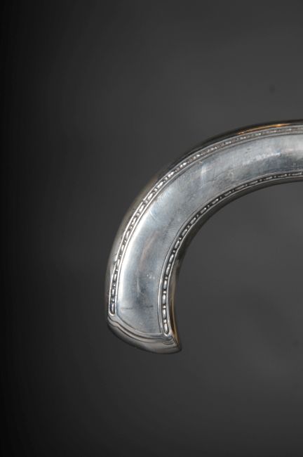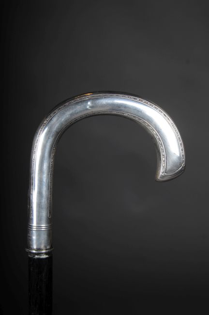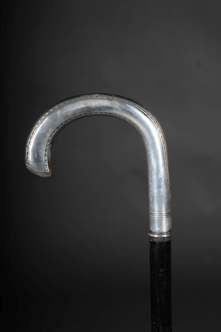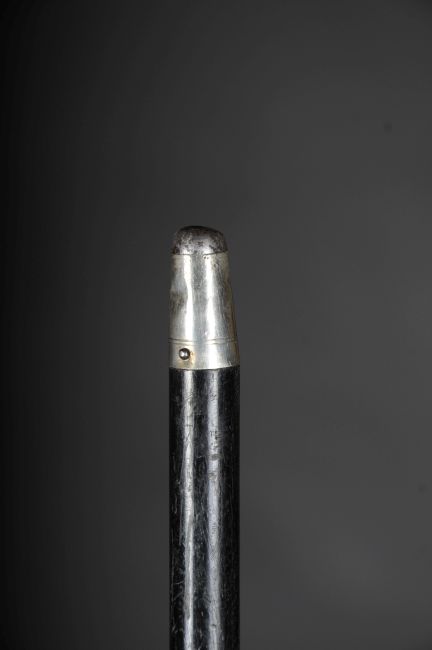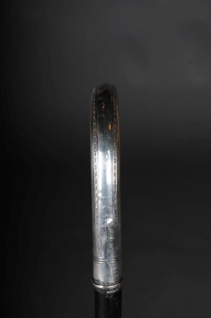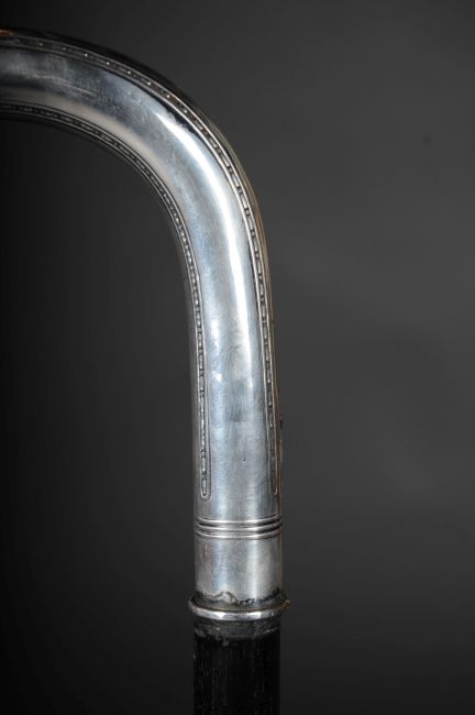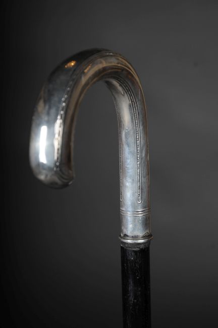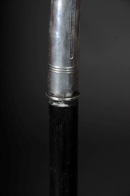 Bâton en bois massif, noirci avec monture en argent croissant et couronne 800. Allemagne vers 19. siècle La buse au bout du bâton est également en argent 800. Gravure argentique très élégante et de grande qualité. Poignée distinctive en argent massif.